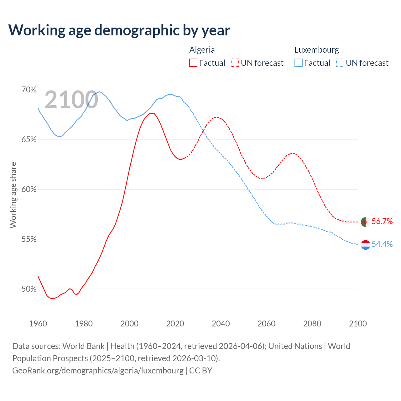 - Algeria has 30.4M working age adults (aged 15-64) vs 477K in Luxembourg.
