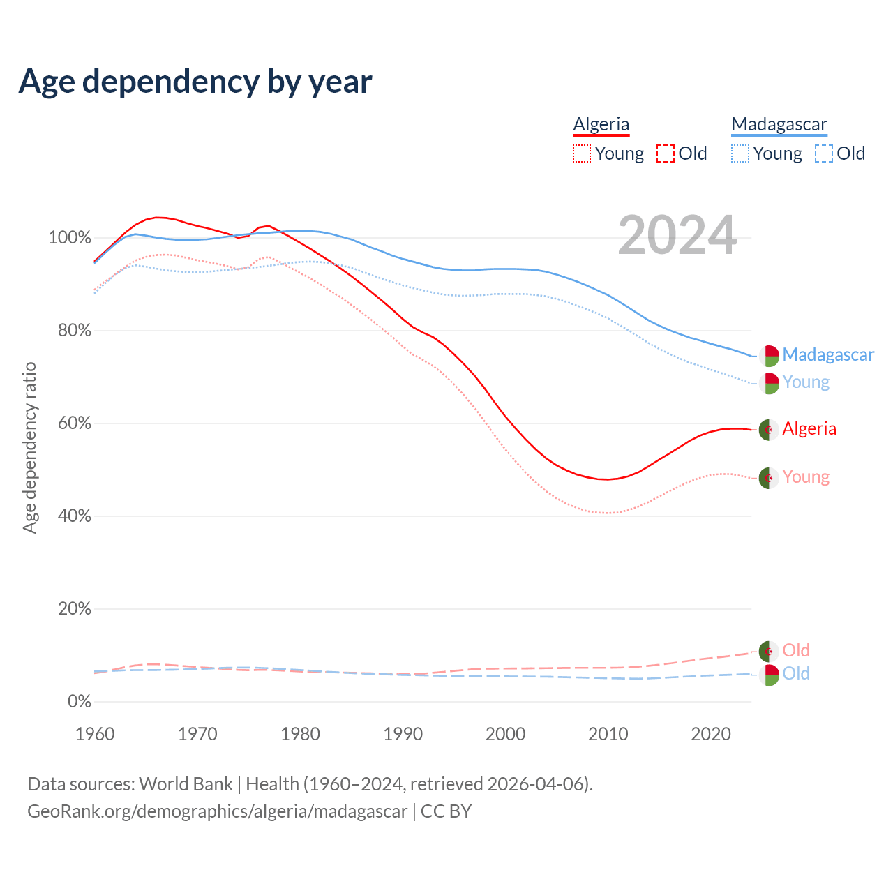 - The share of old-age demographic (65+) in Algeria is 6.58% vs 3.41% in Madagascar.