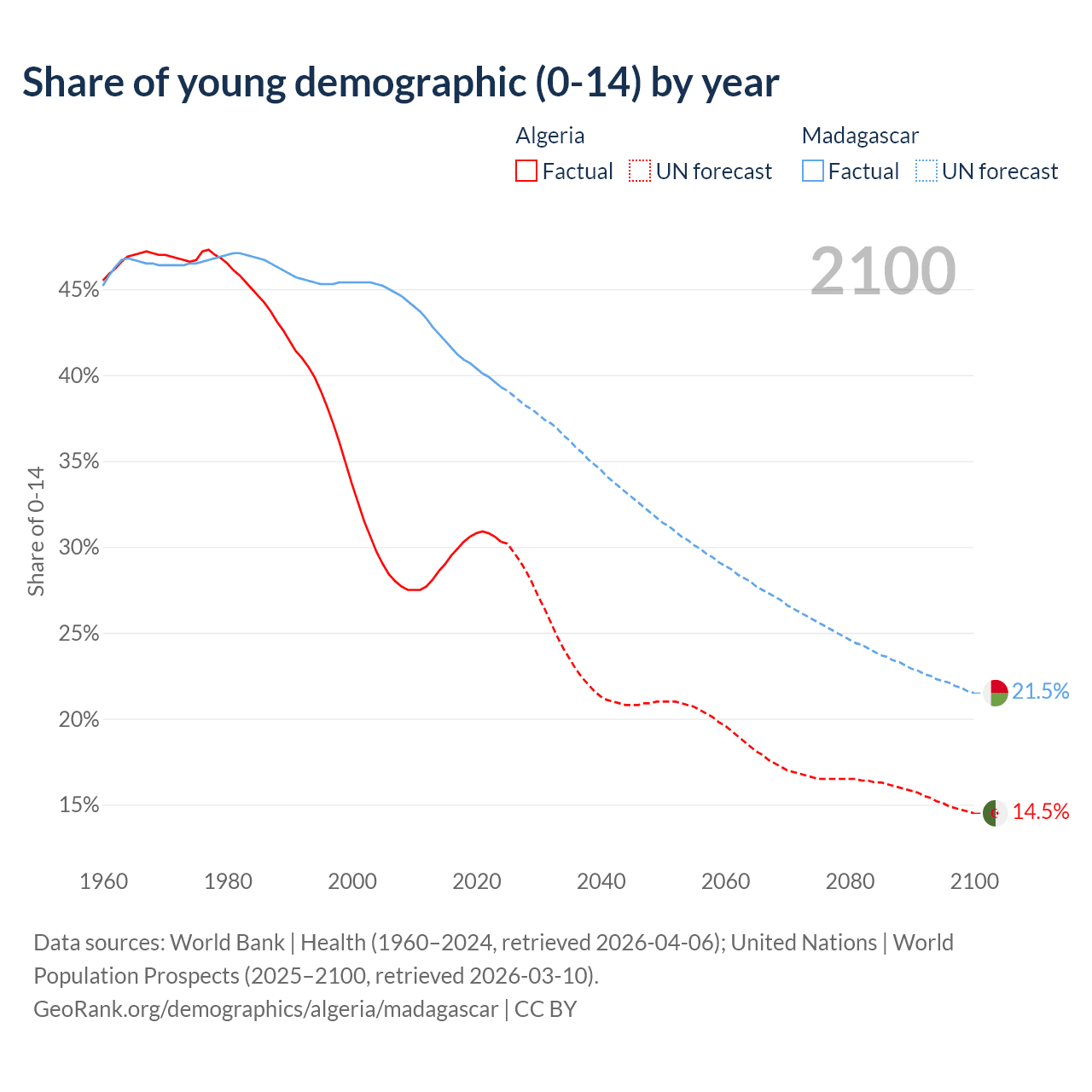 - Algeria is ranked 111/196 by median age (oldest to youngest) vs 165/196 for Madagascar.