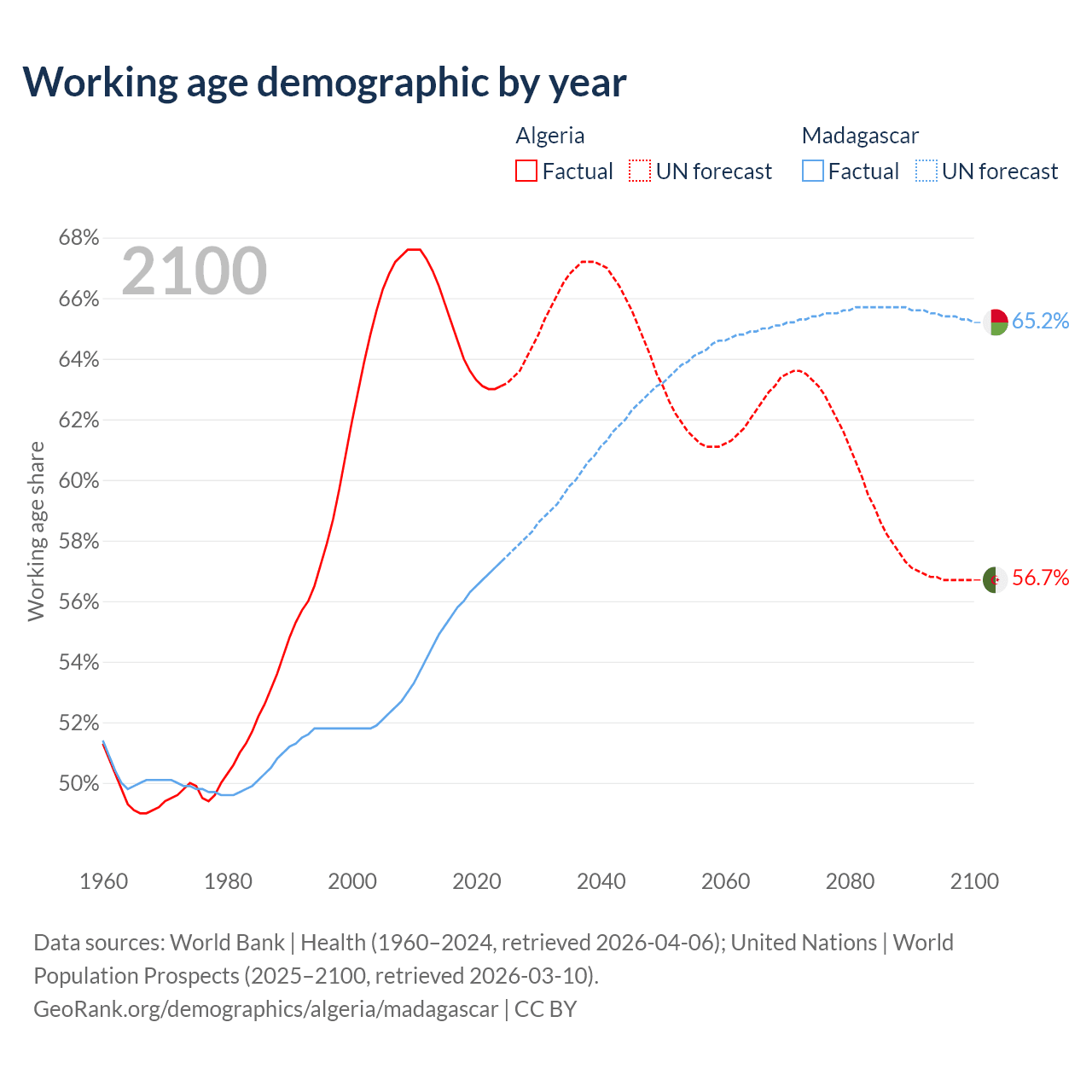 - Algeria has 30.4M working age adults (aged 15-64) vs 19.4M in Madagascar.