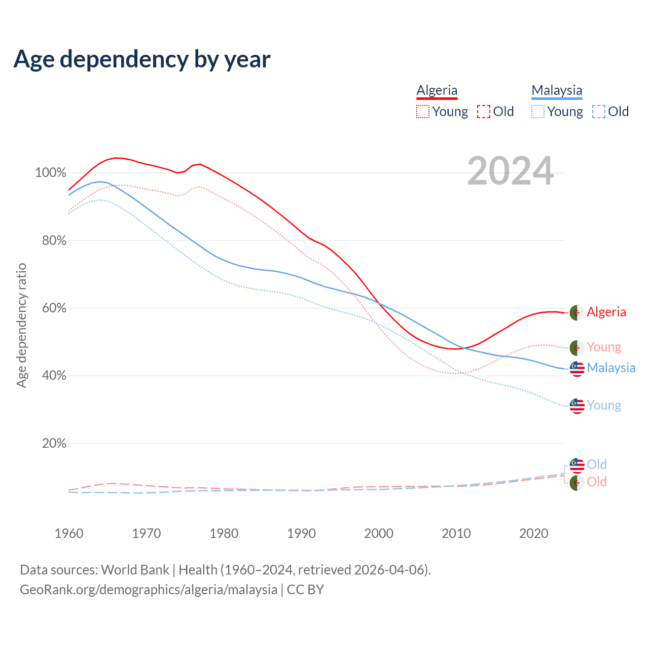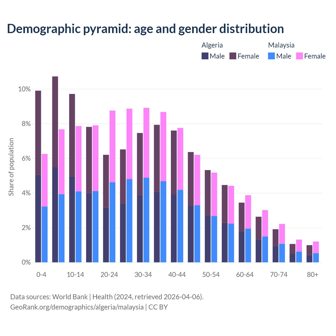 - Algeria is ranked 111/196 by median age (oldest to youngest) vs 92/196 for Malaysia.