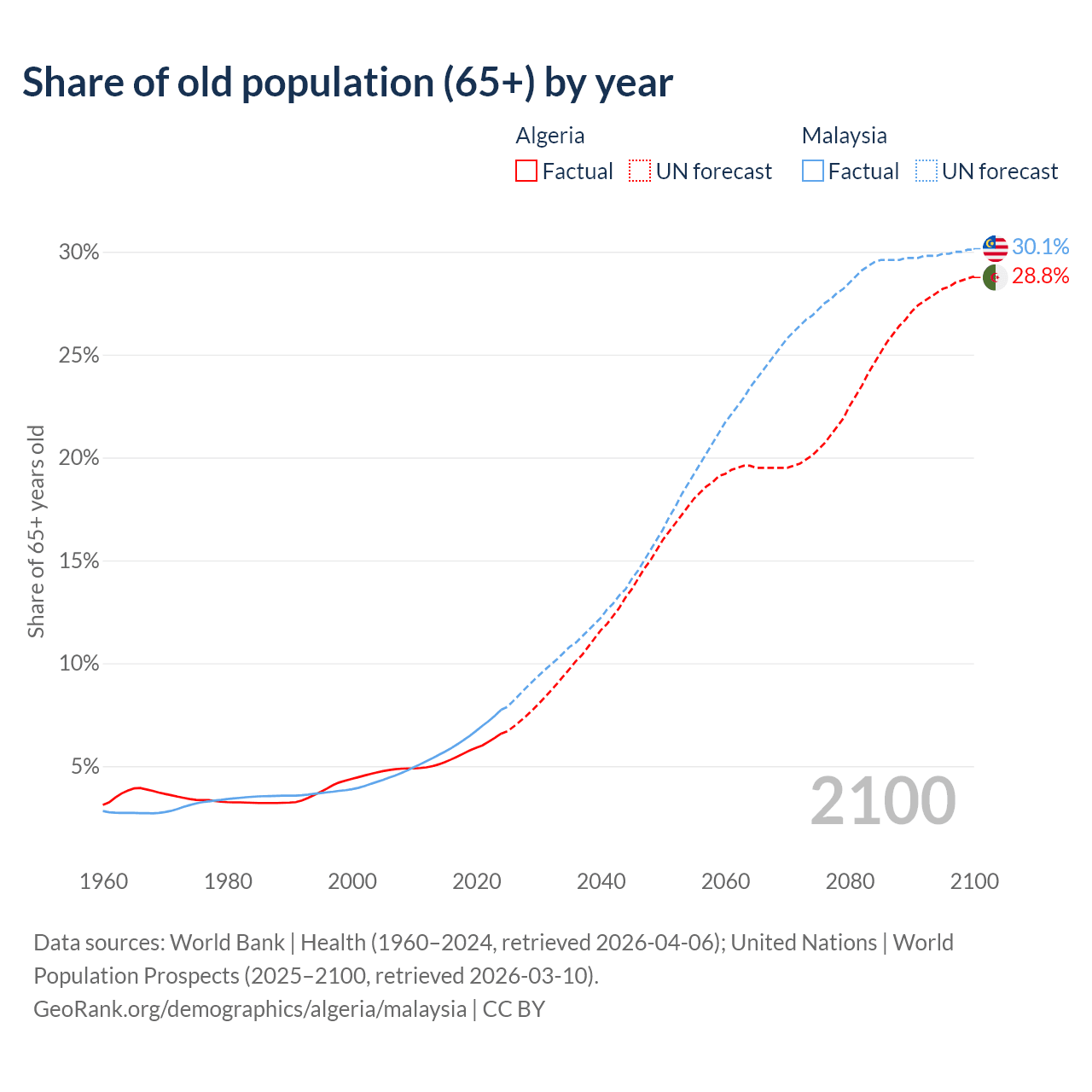 The share of older people aged 65 and over is 6.58% in Algeria and 7.74% in Malaysia. Life expectancy in Algeria compared to Malaysia .