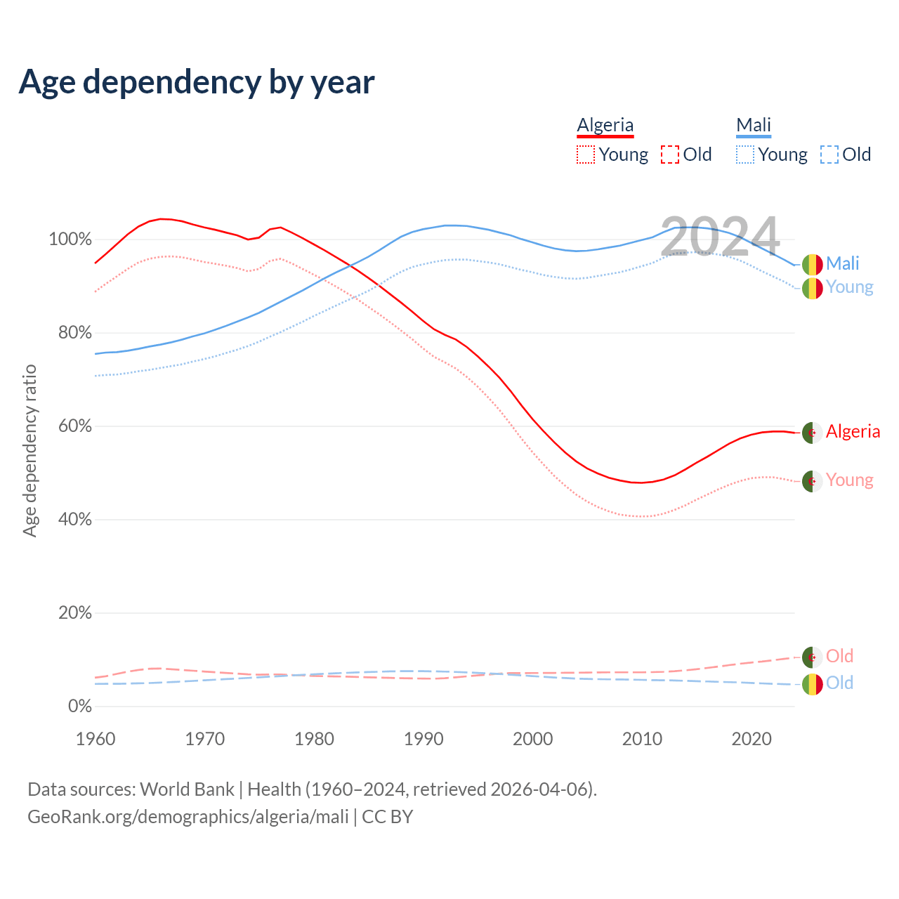 - Algeria is ranked 111/196 by median age (oldest to youngest) vs 193/196 for Mali.