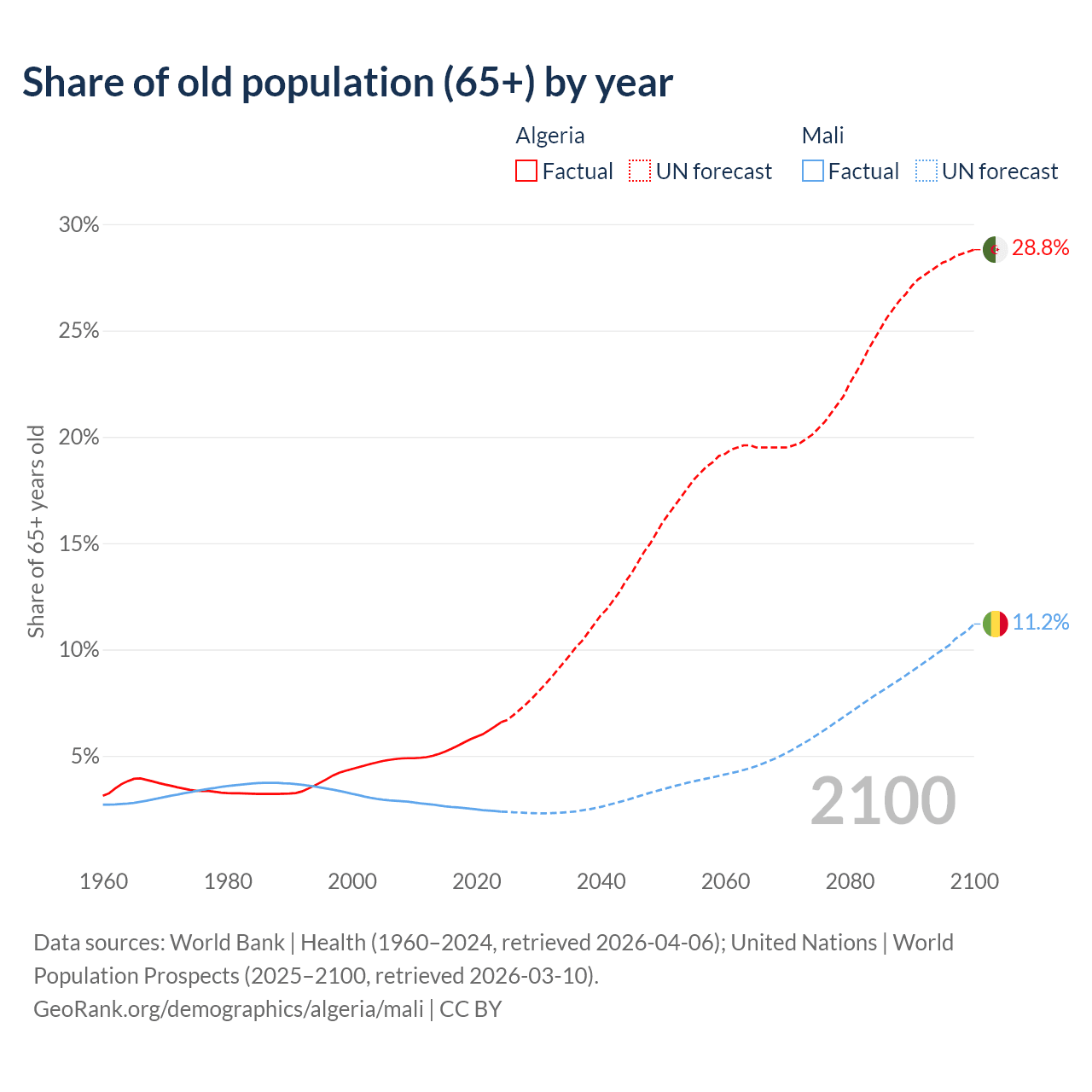 The share of older people aged 65 and over is 6.58% in Algeria and 2.38% in Mali. Life expectancy in Algeria compared to Mali .