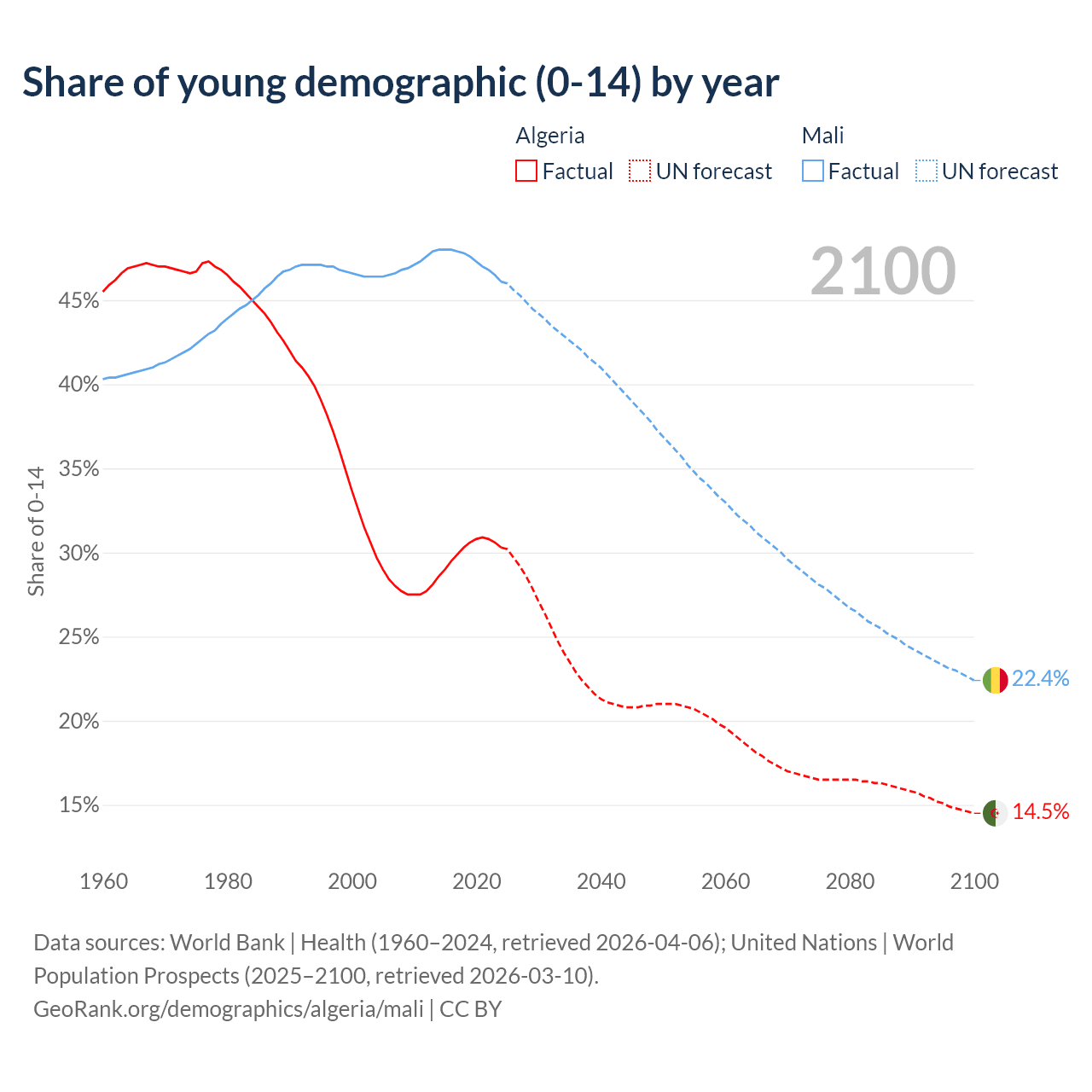 - The share of young demographic (0-15 years old) in Algeria is 30.3% vs 46.1% in Mali.
