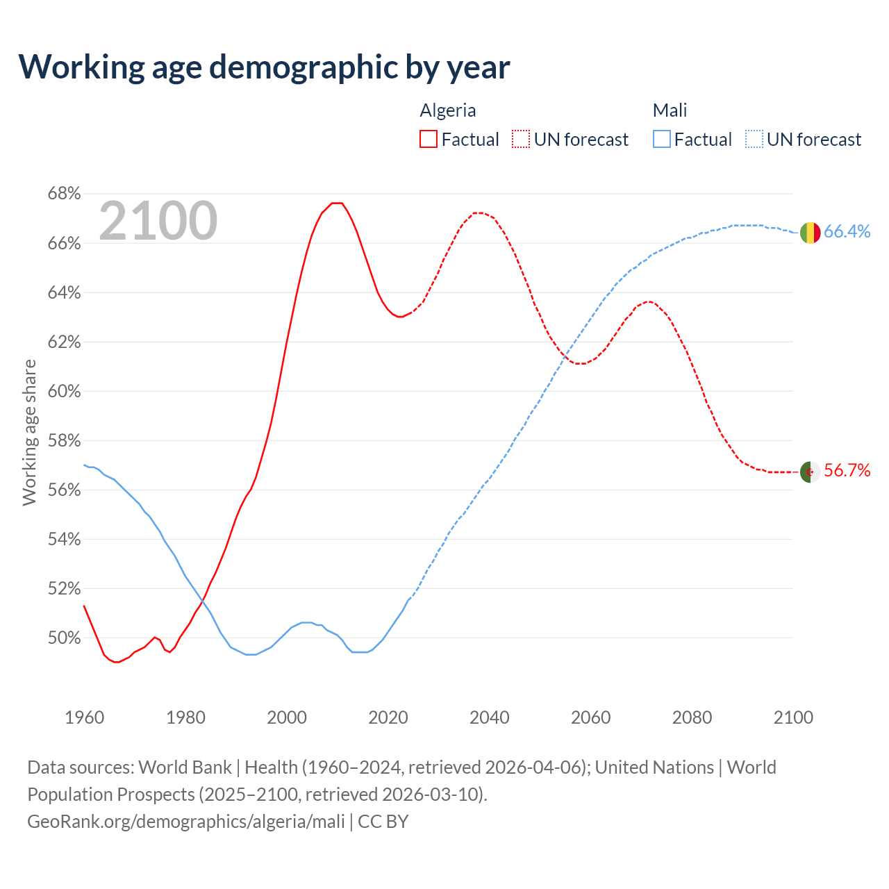 - Algeria has 30.4M working age adults (aged 15-64) vs 13.5M in Mali.