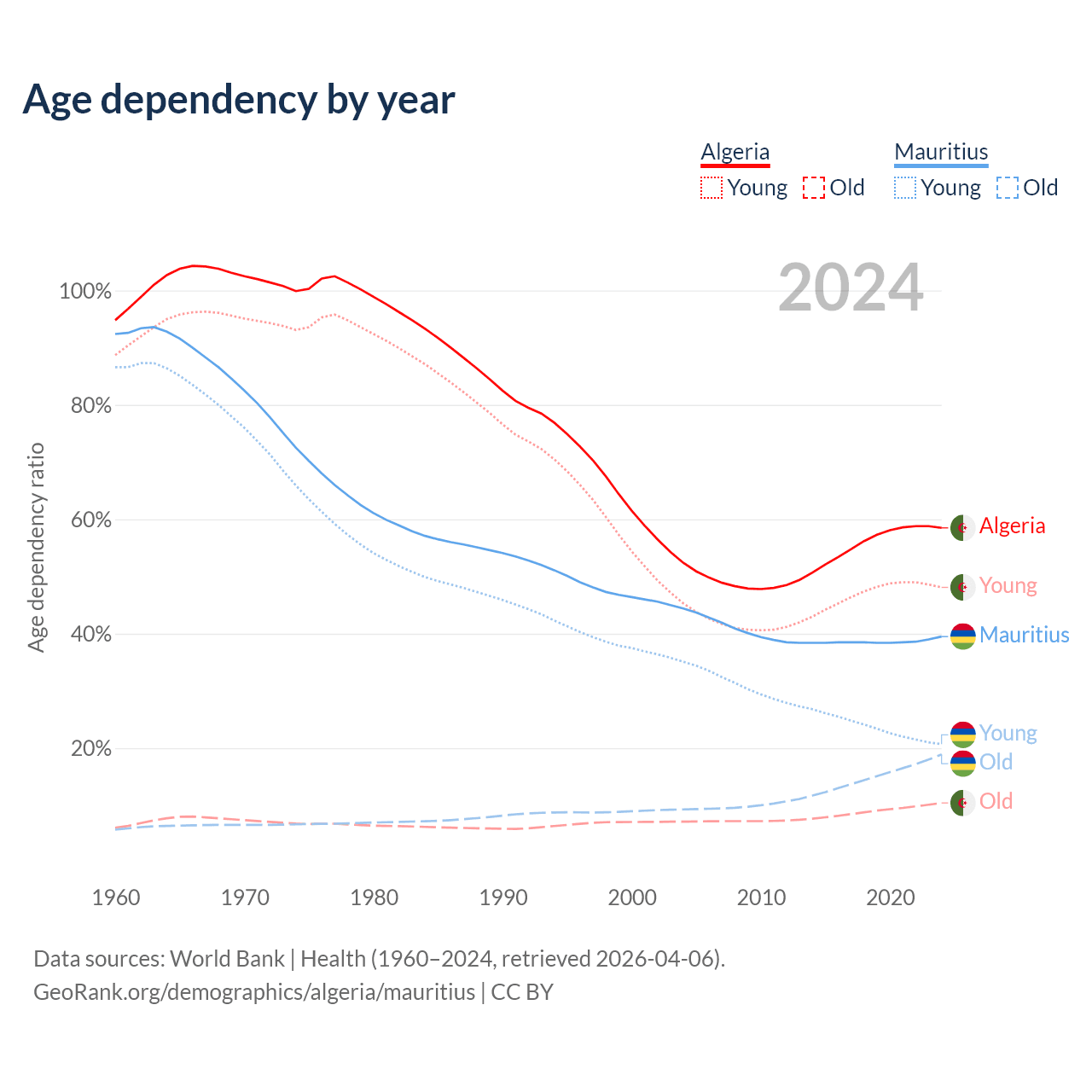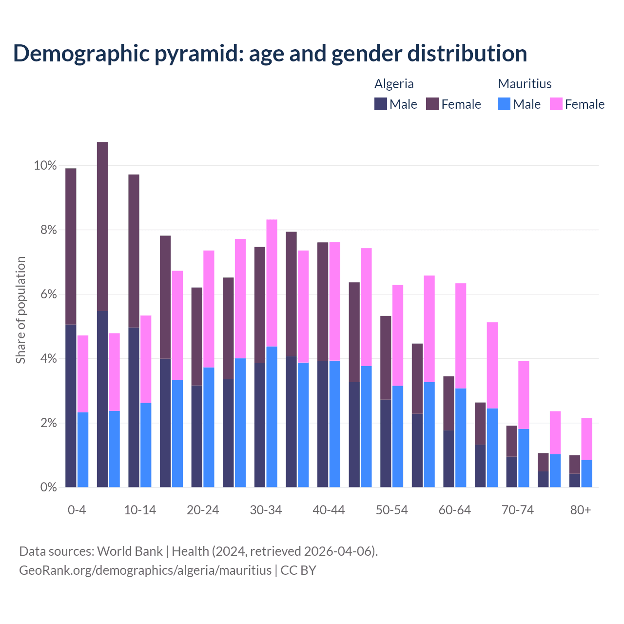 The share of older people aged 65 and over is 6.58% in Algeria and 13.5% in Mauritius. Life expectancy in Algeria compared to Mauritius .