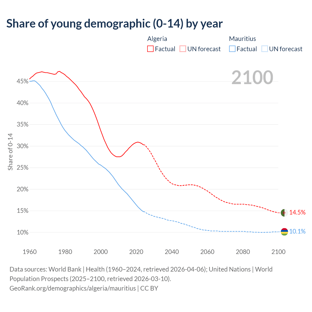 - The share of young demographic (0-15 years old) in Algeria is 30.3% vs 14.8% in Mauritius.