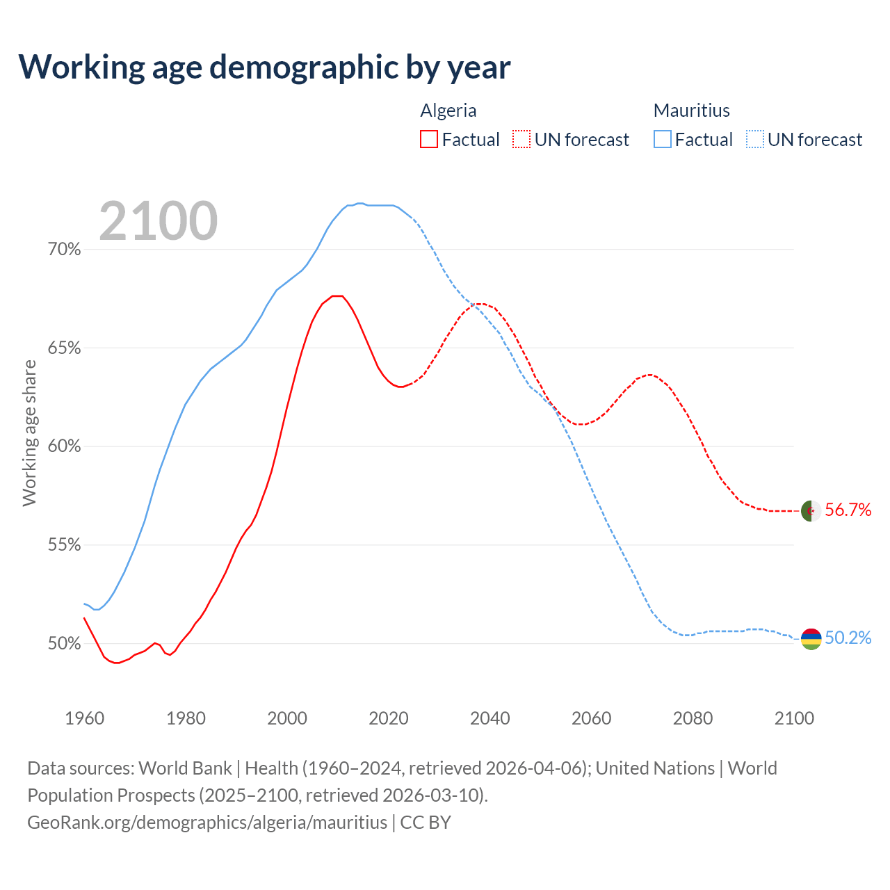 Median age Algeria vs Mauritius, 1960-2100