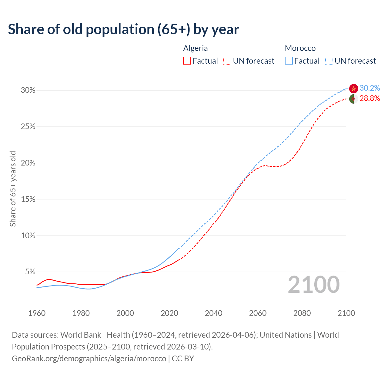 The share of older people aged 65 and over is 6.58% in Algeria and 8.14% in Morocco. Life expectancy in Algeria compared to Morocco .