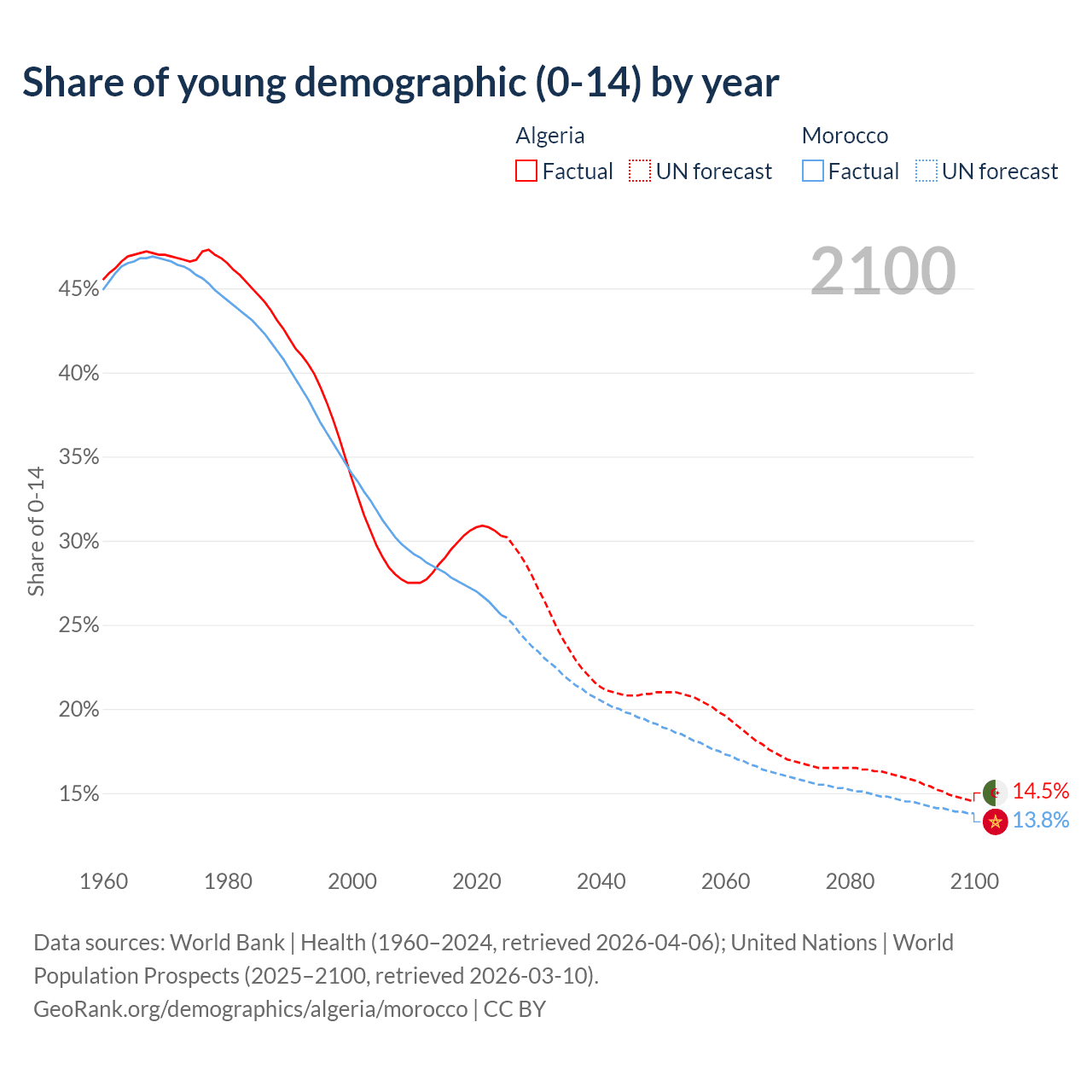 - The total fertility rate is 2.77 in Algeria compared to 2.23 in Morocco.