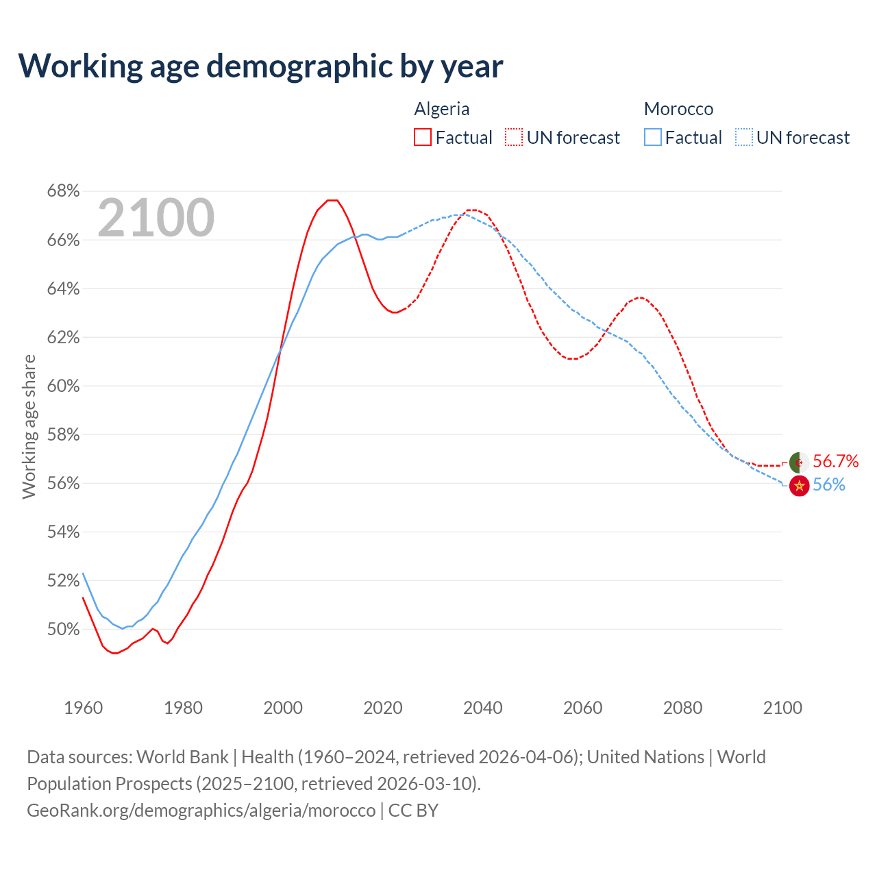 - Algeria has 30.4M working age adults (aged 15-64) vs 25.7M in Morocco.
