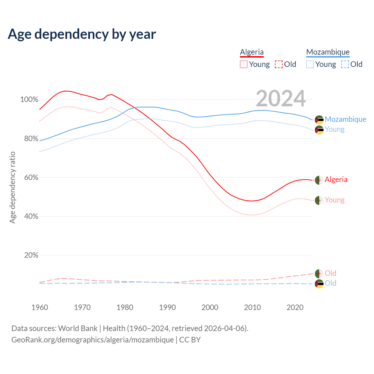 - Algeria is ranked 111/196 by median age (oldest to youngest) vs 189/196 for Mozambique.