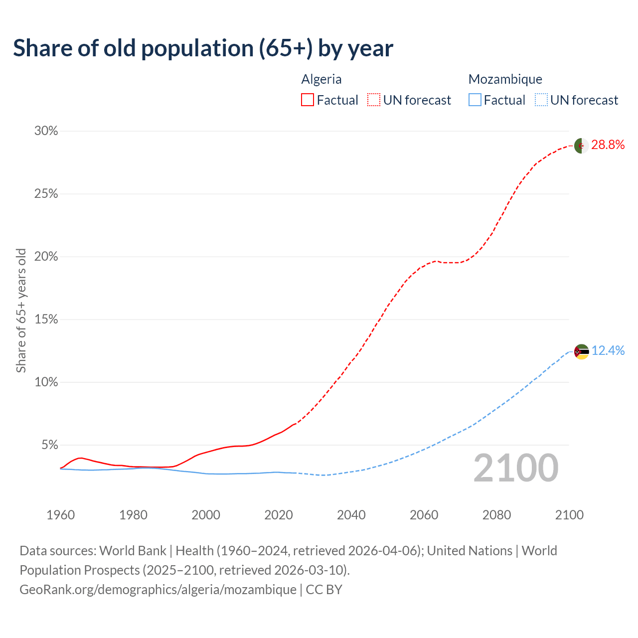 The share of older people aged 65 and over is 6.58% in Algeria and 2.75% in Mozambique. Life expectancy in Algeria compared to Mozambique .