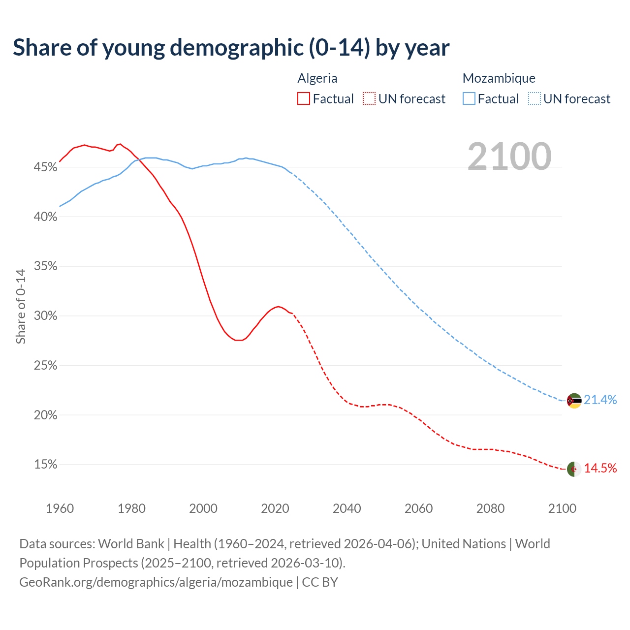 - The share of young demographic (0-15 years old) in Algeria is 30.3% vs 44.5% in Mozambique.