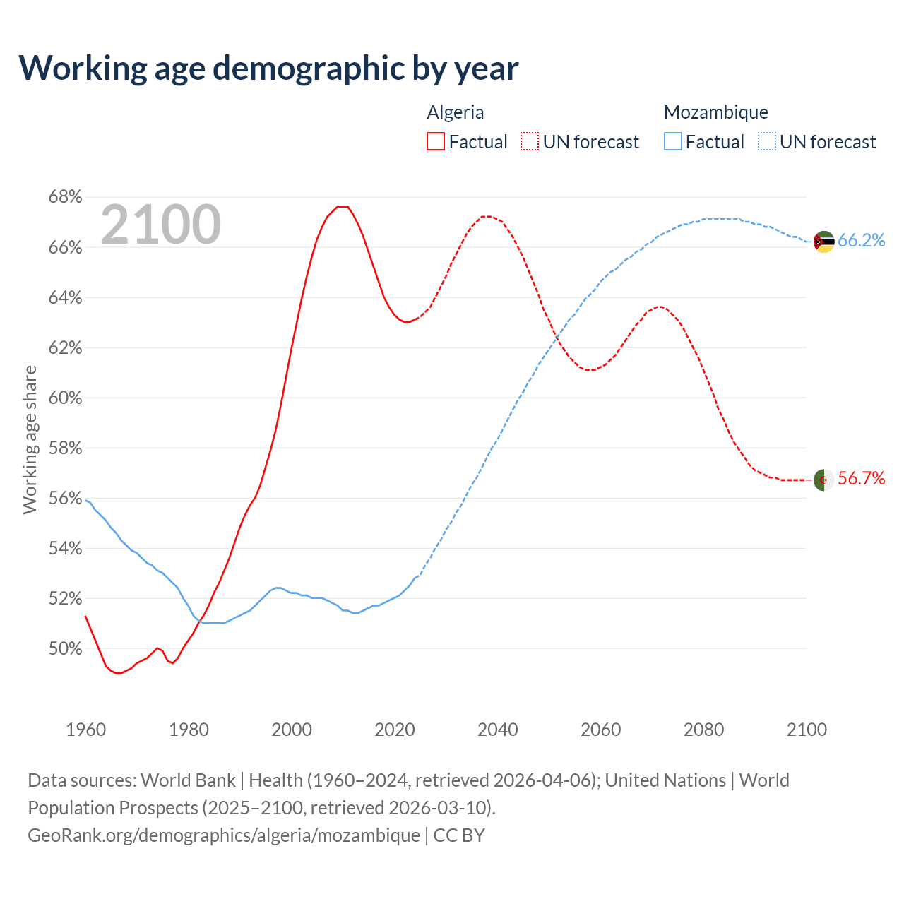 - Algeria has 30.4M working age adults (aged 15-64) vs 19.5M in Mozambique.
