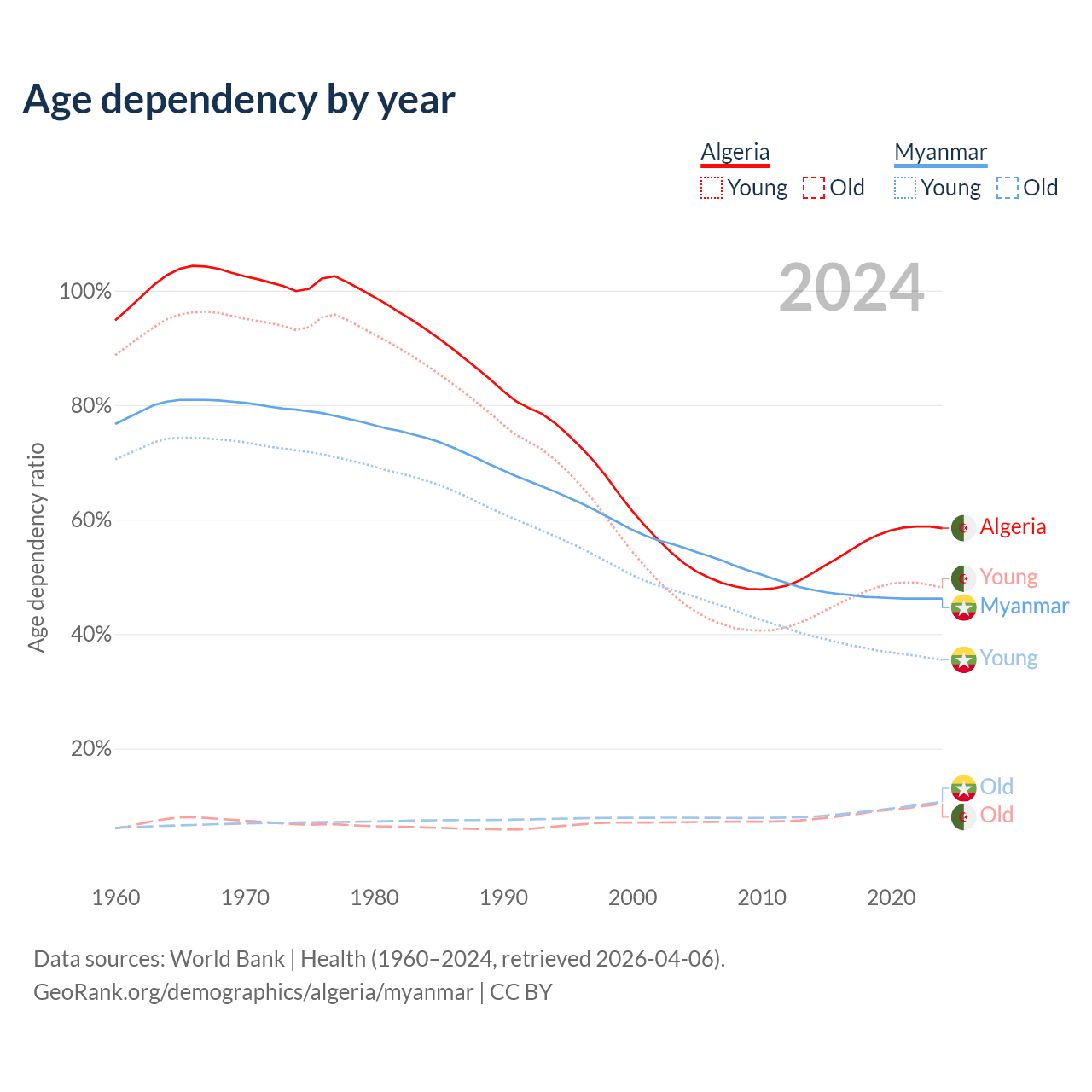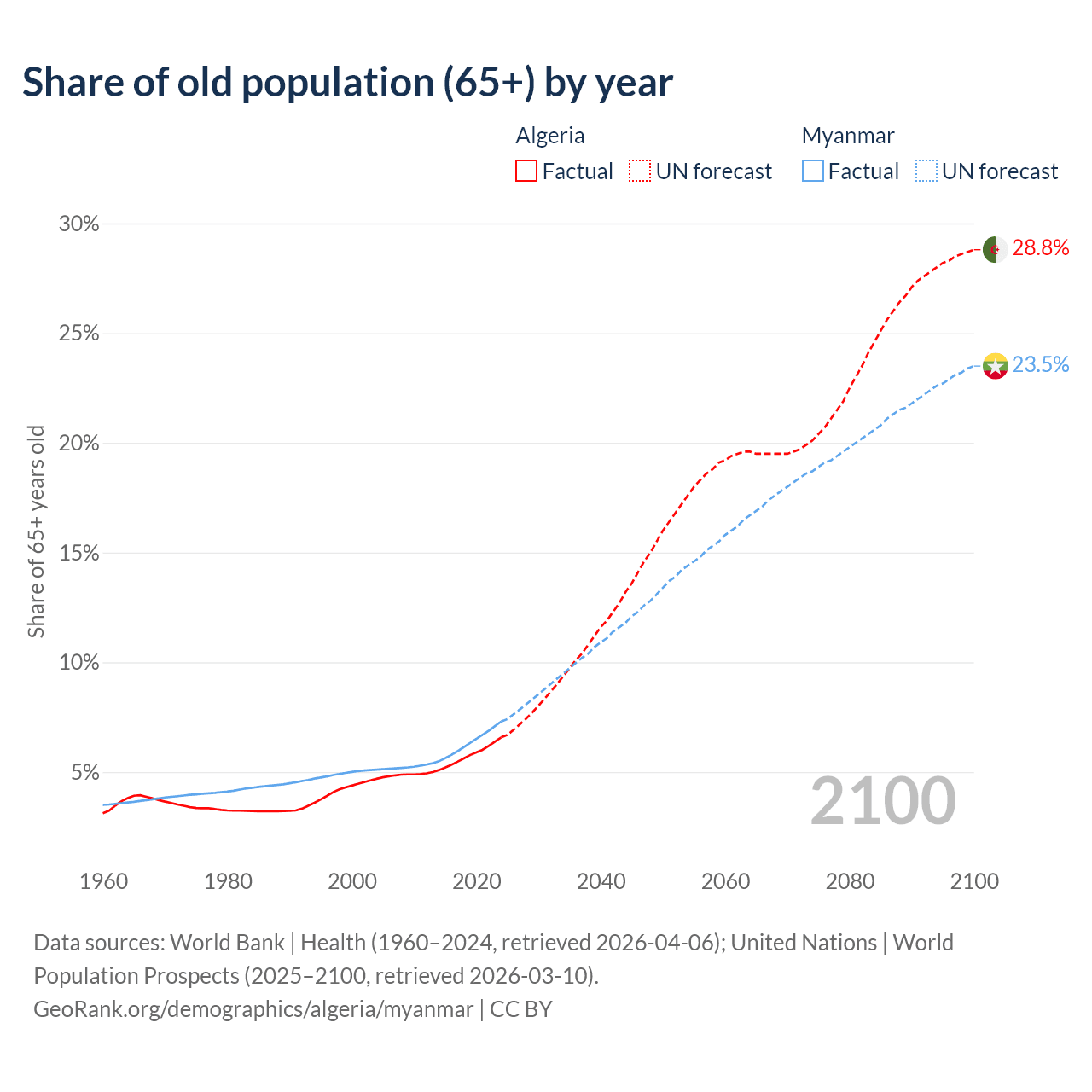 The share of older people aged 65 and over is 6.58% in Algeria and 7.3% in Myanmar. Life expectancy in Algeria compared to Myanmar .