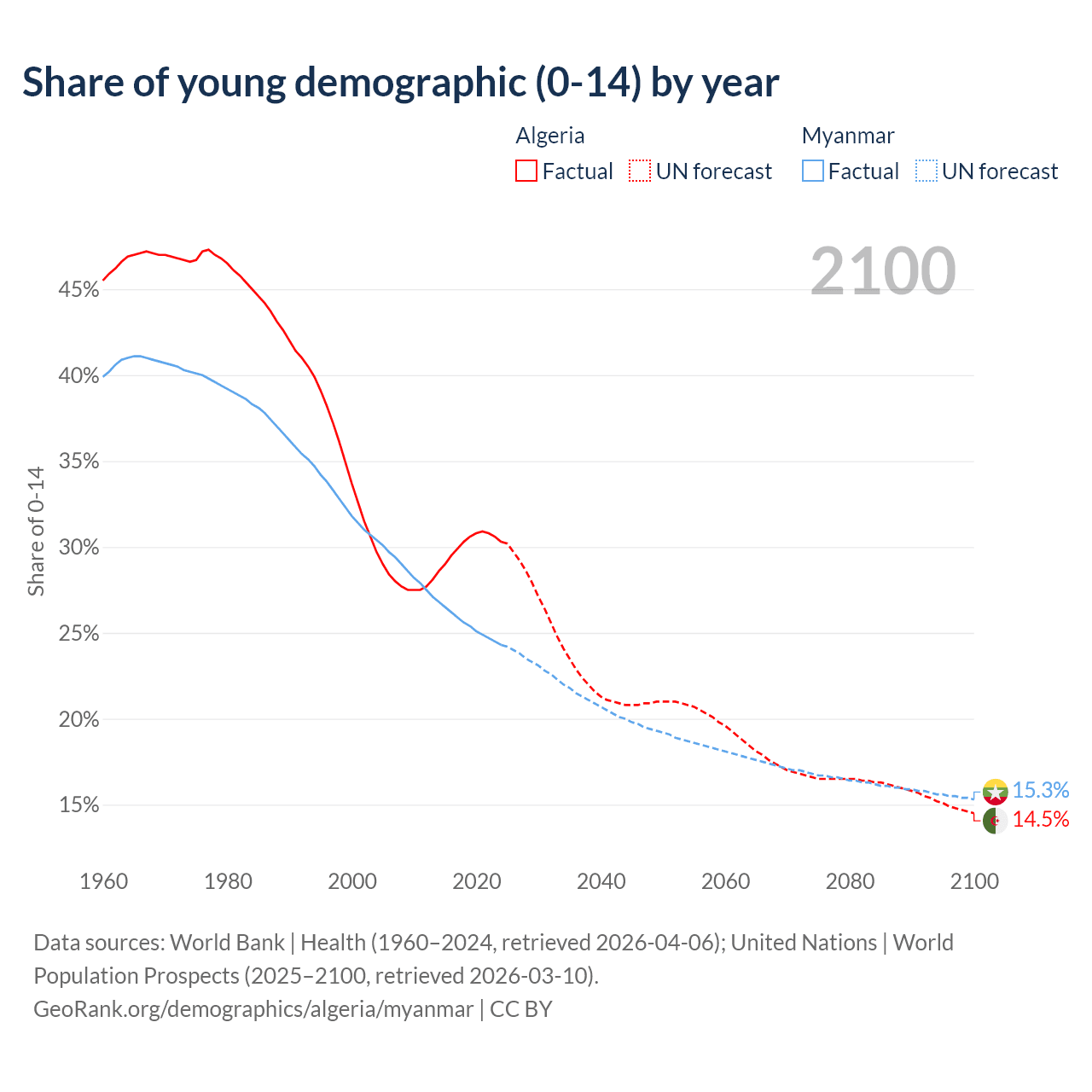 - The share of young demographic (0-15 years old) in Algeria is 30.3% vs 24.3% in Myanmar.