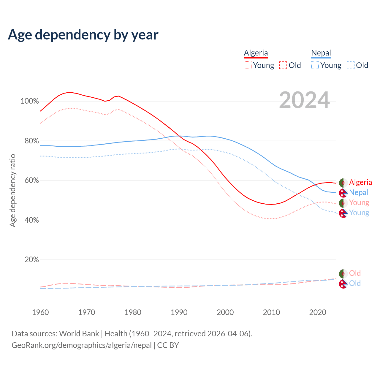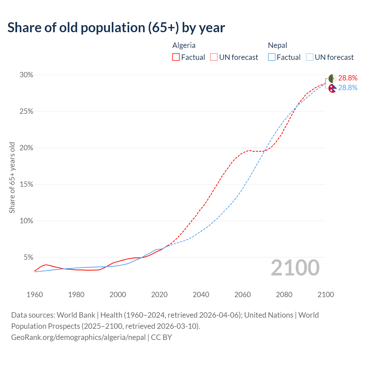 - The share of old-age demographic (65+) in Algeria is 6.58% vs 6.5% in Nepal.