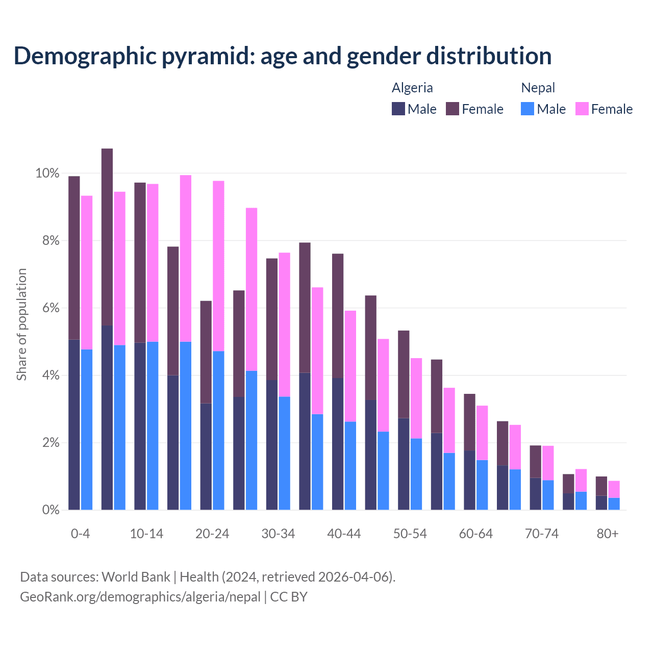 - Algeria is ranked 111/196 by median age (oldest to youngest) vs 127/196 for Nepal.