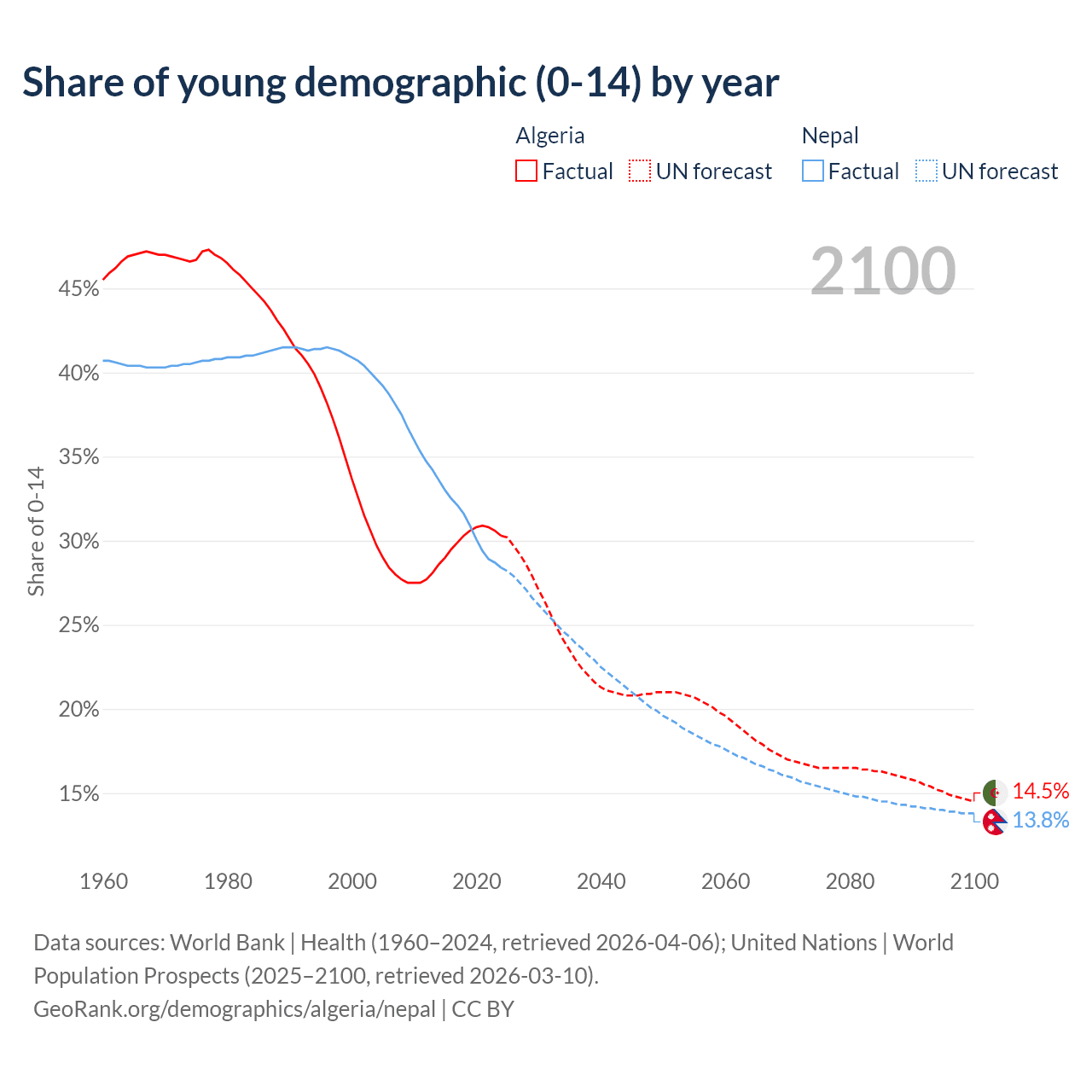- The share of young demographic (0-15 years old) in Algeria is 30.3% vs 28.4% in Nepal.