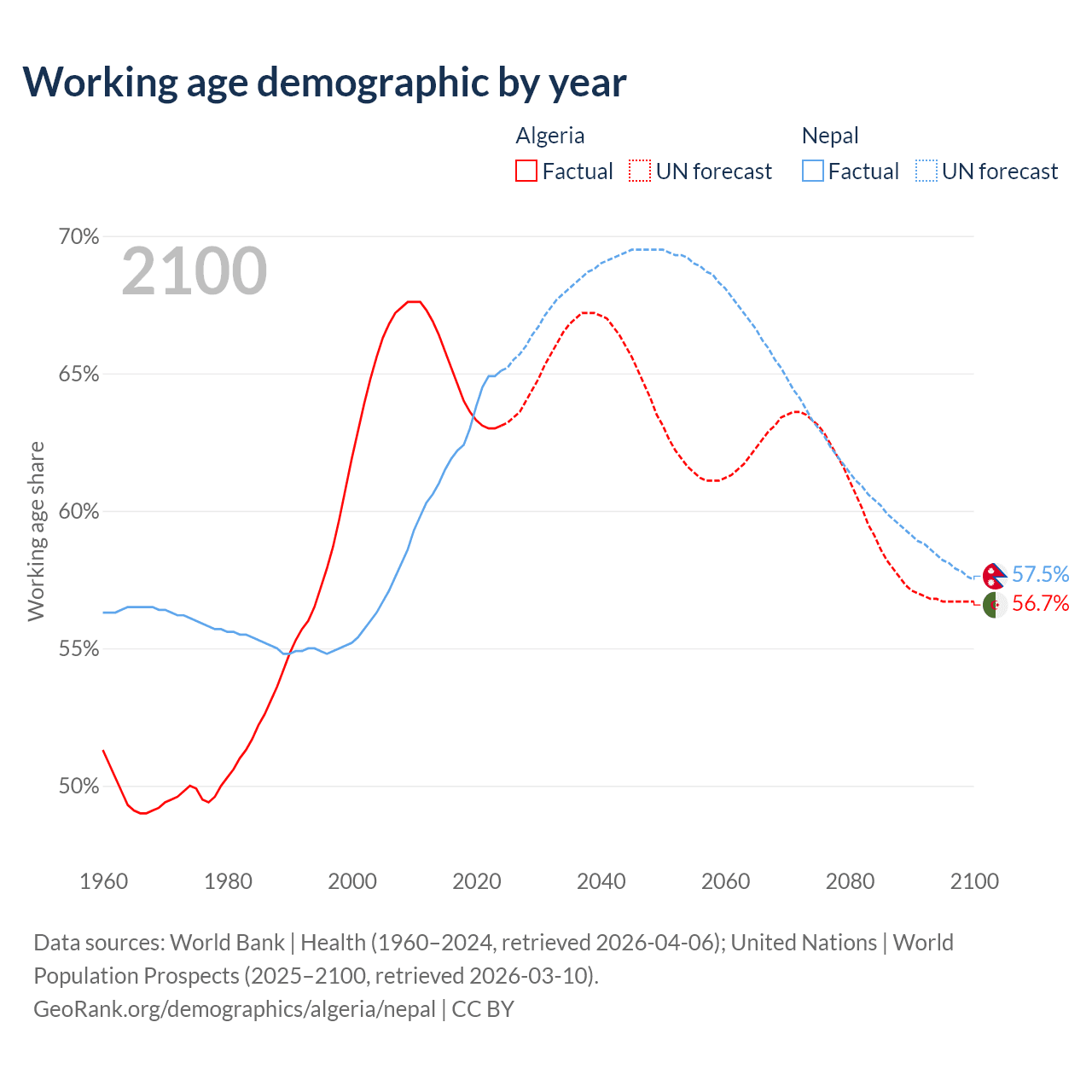 - Algeria has 30.4M working age adults (aged 15-64) vs 19.3M in Nepal.