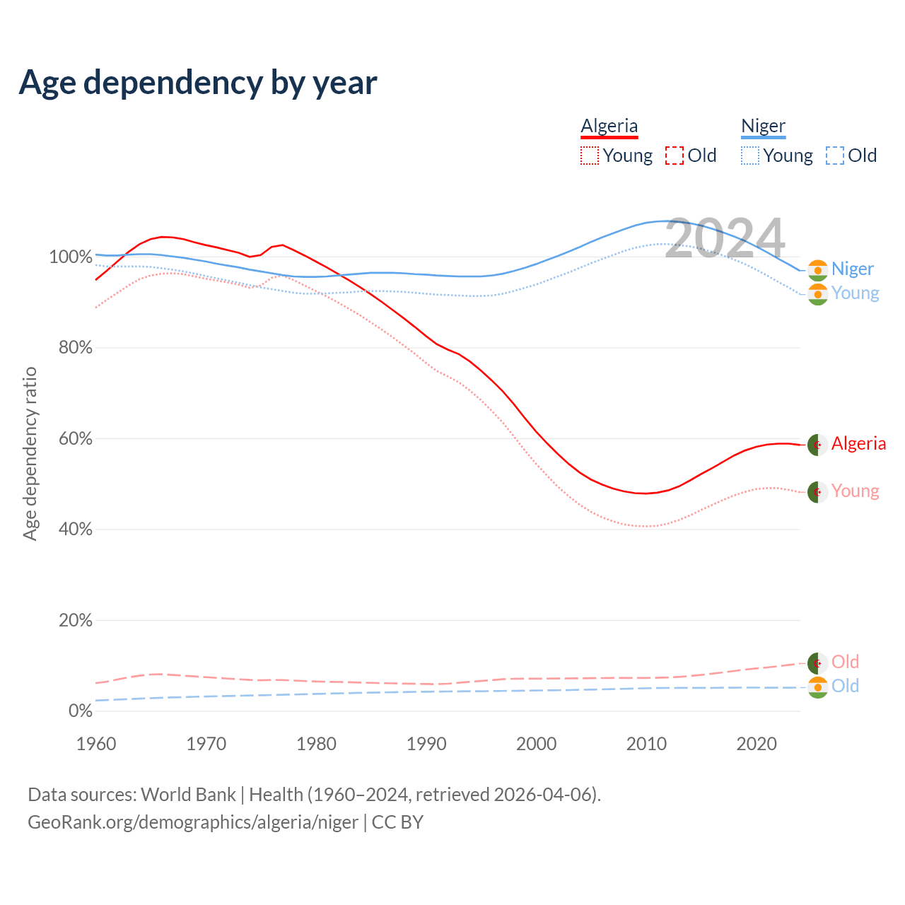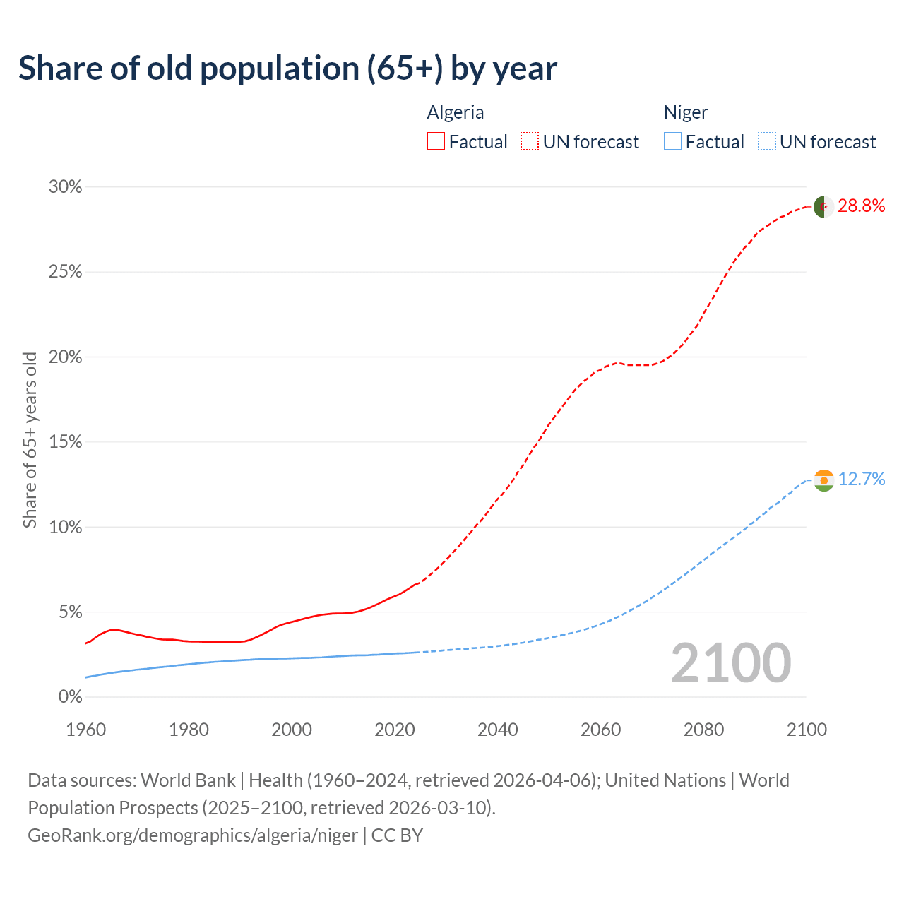 - The share of old-age demographic (65+) in Algeria is 6.58% vs 2.59% in Niger.