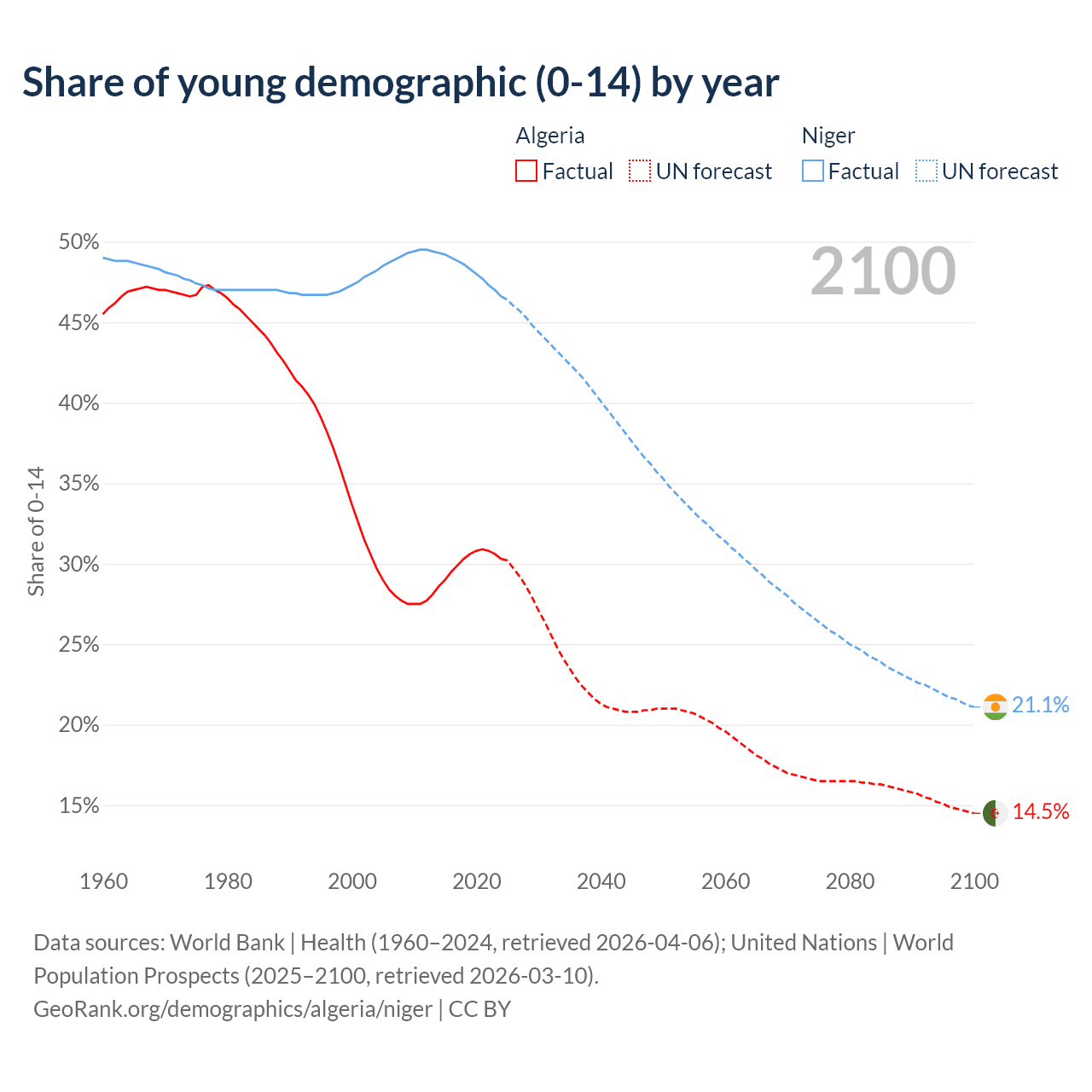 - The share of young demographic (0-15 years old) in Algeria is 30.3% vs 46.6% in Niger.