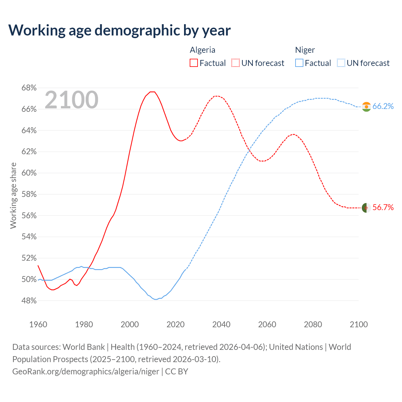 - Algeria has 30.4M working age adults (aged 15-64) vs 14.8M in Niger.