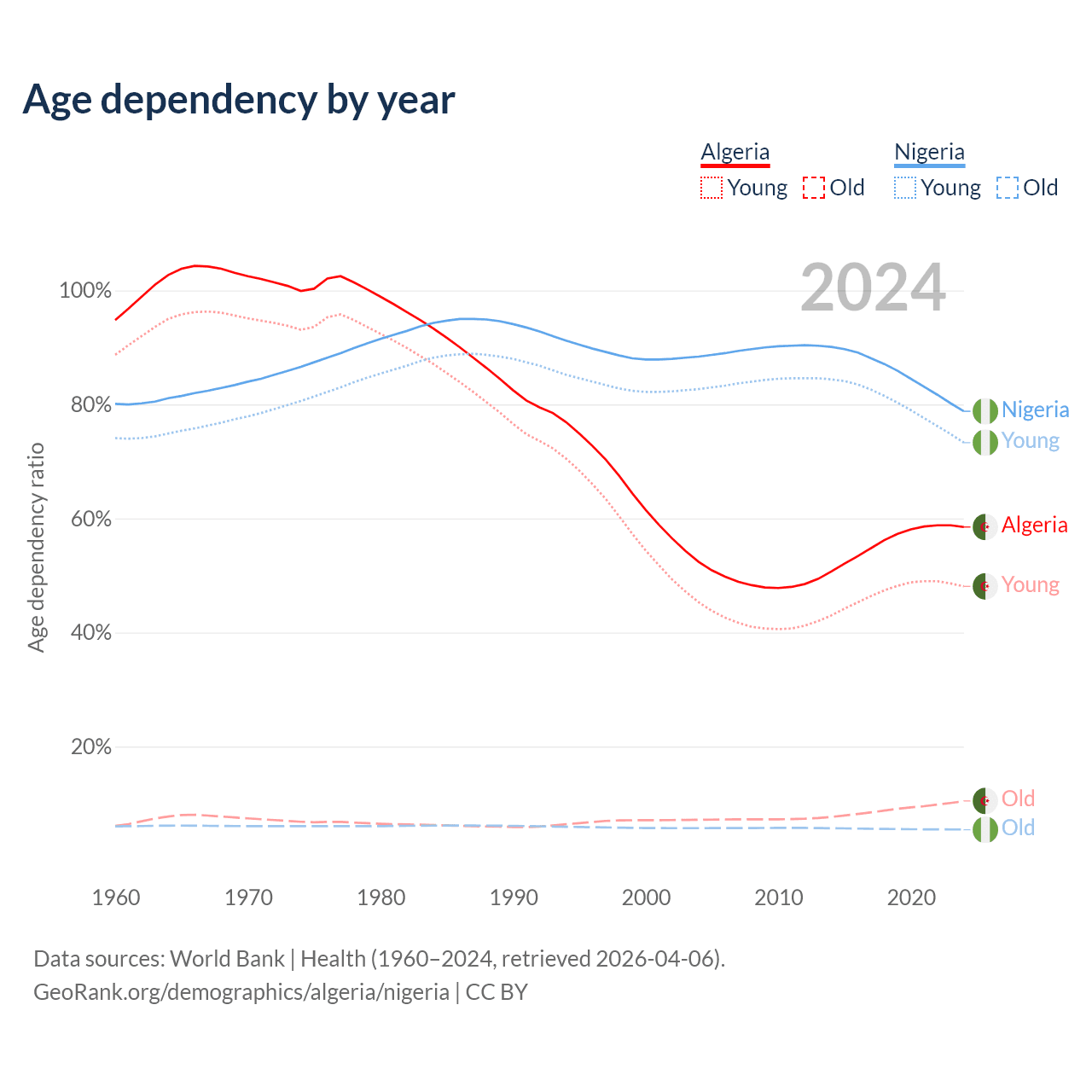 - Algeria is ranked 111/196 by median age (oldest to youngest) vs 178/196 for Nigeria.