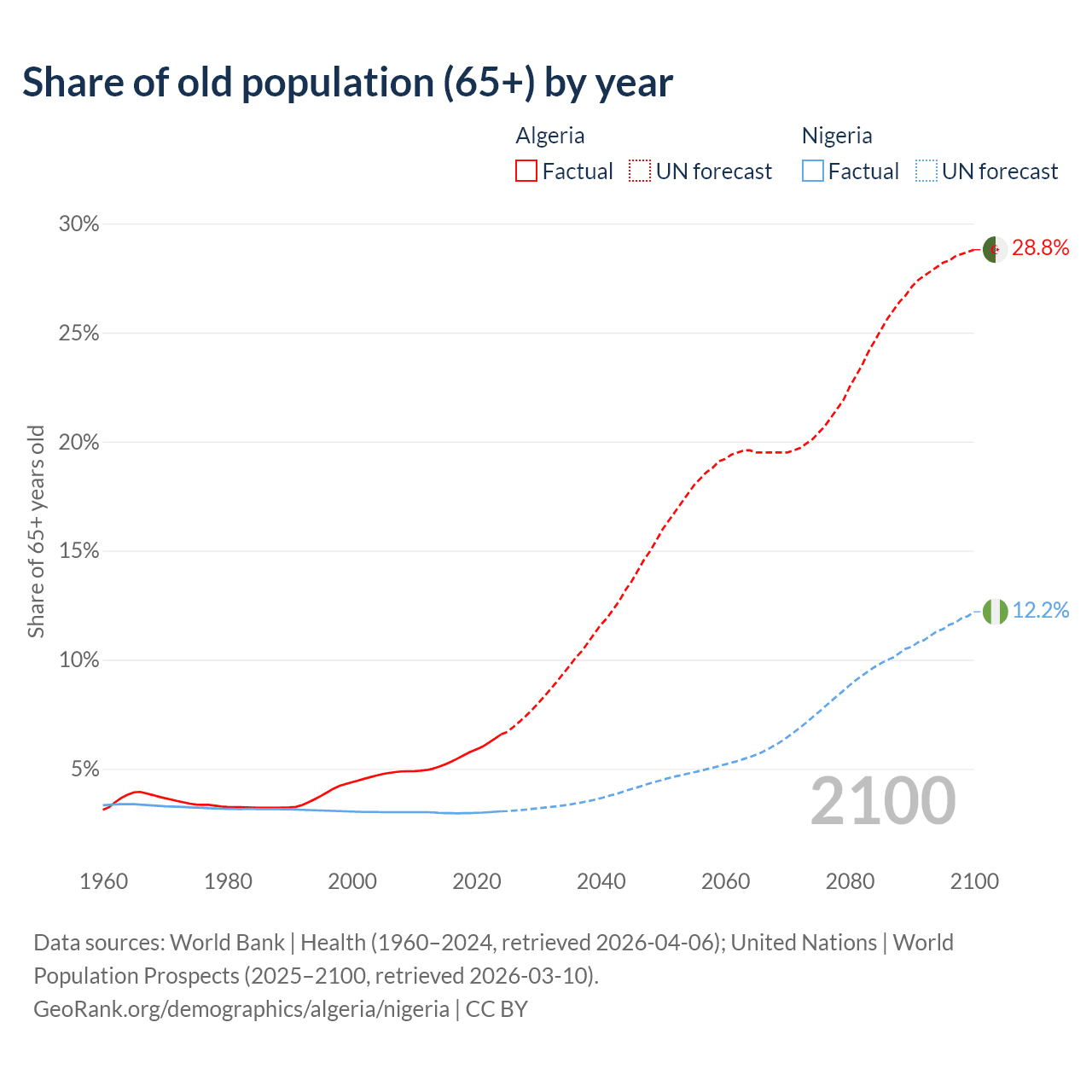 The share of older people aged 65 and over is 6.58% in Algeria and 3.05% in Nigeria. Life expectancy in Algeria compared to Nigeria .