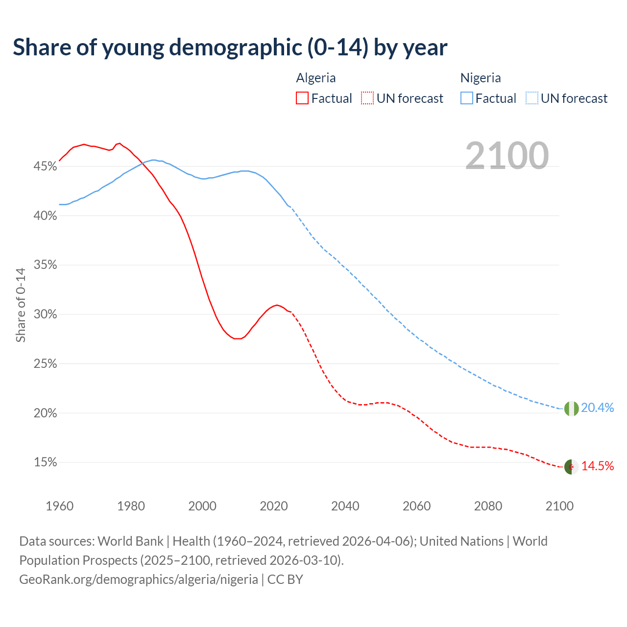 Median age Algeria vs Nigeria, 1960-2100