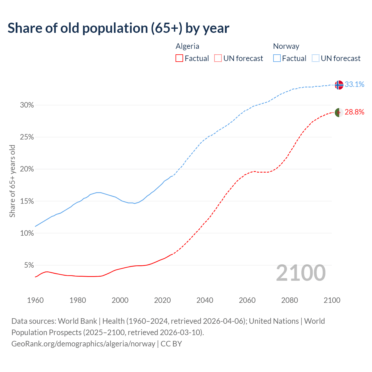 The share of older people aged 65 and over is 6.58% in Algeria and 18.8% in Norway. Life expectancy in Algeria compared to Norway .