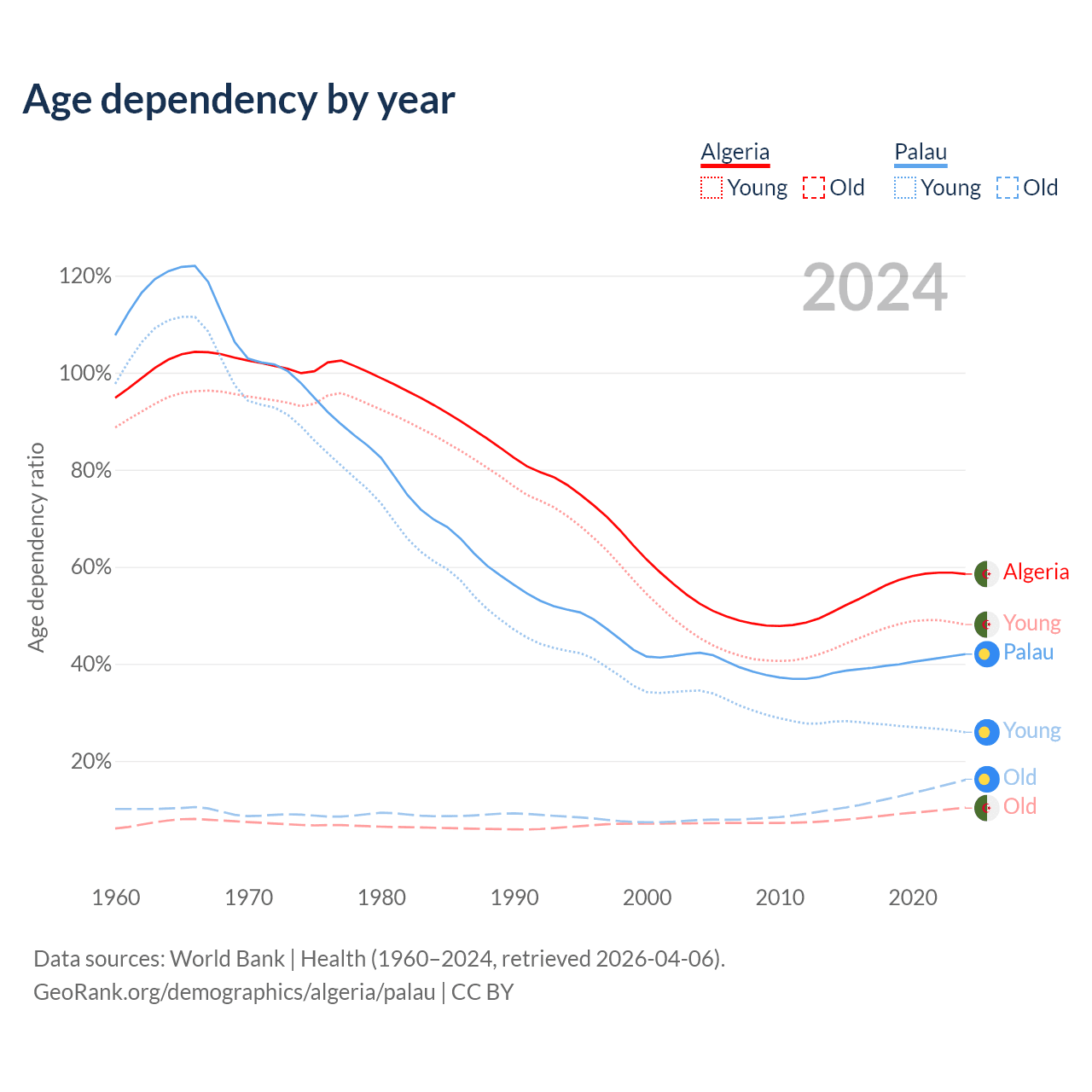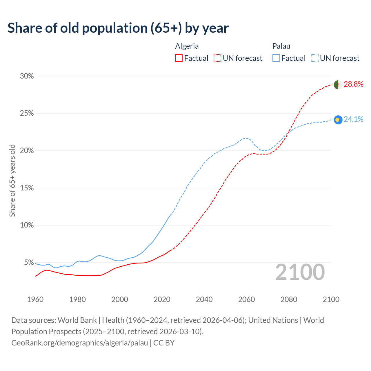 - The share of old-age demographic (65+) in Algeria is 6.58% vs 11.3% in Palau.