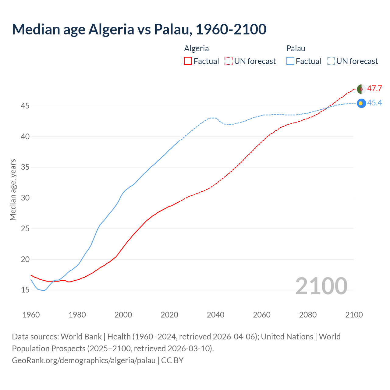 Median age Algeria vs Palau, 1960-2100