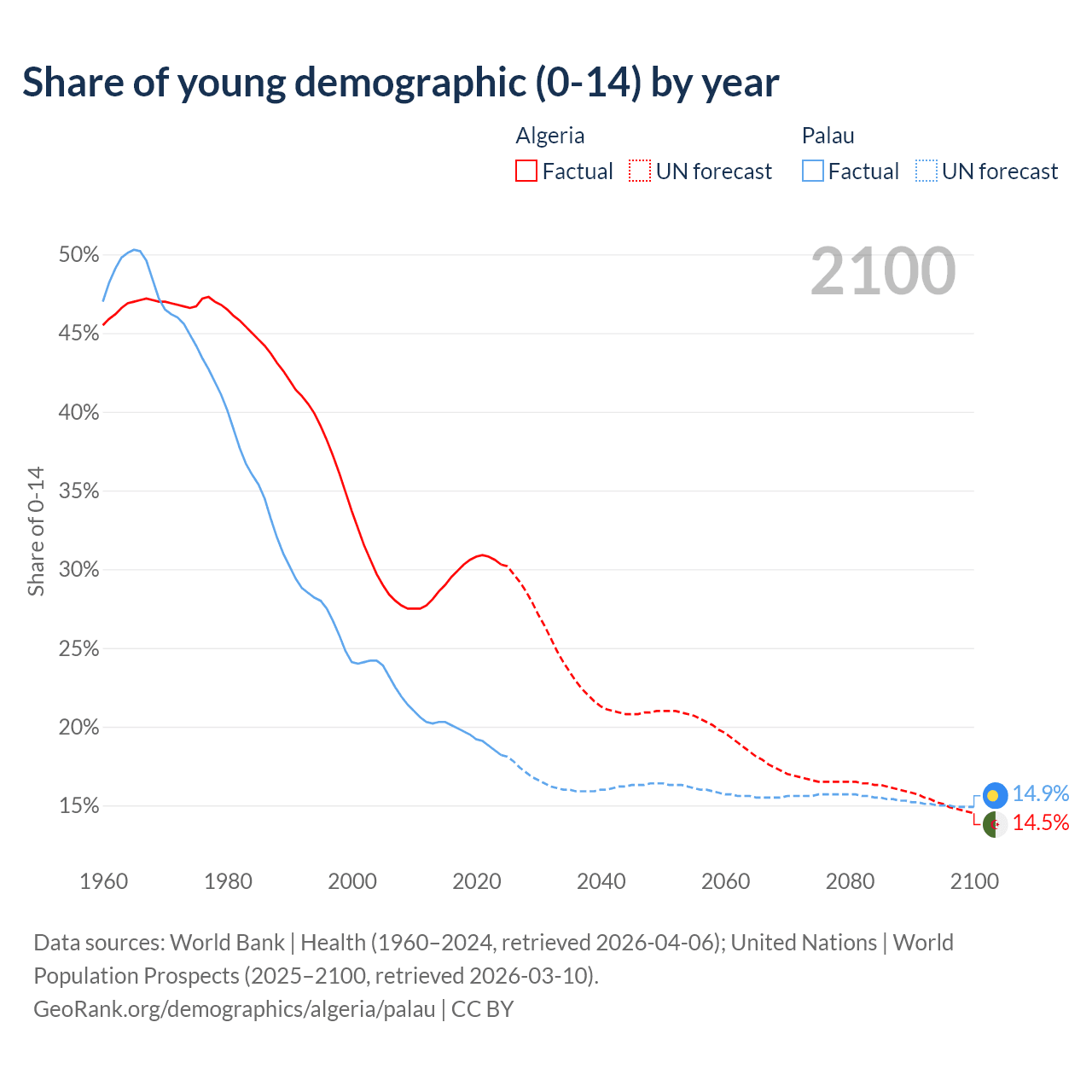 - The share of young demographic (0-15 years old) in Algeria is 30.3% vs 18.2% in Palau.