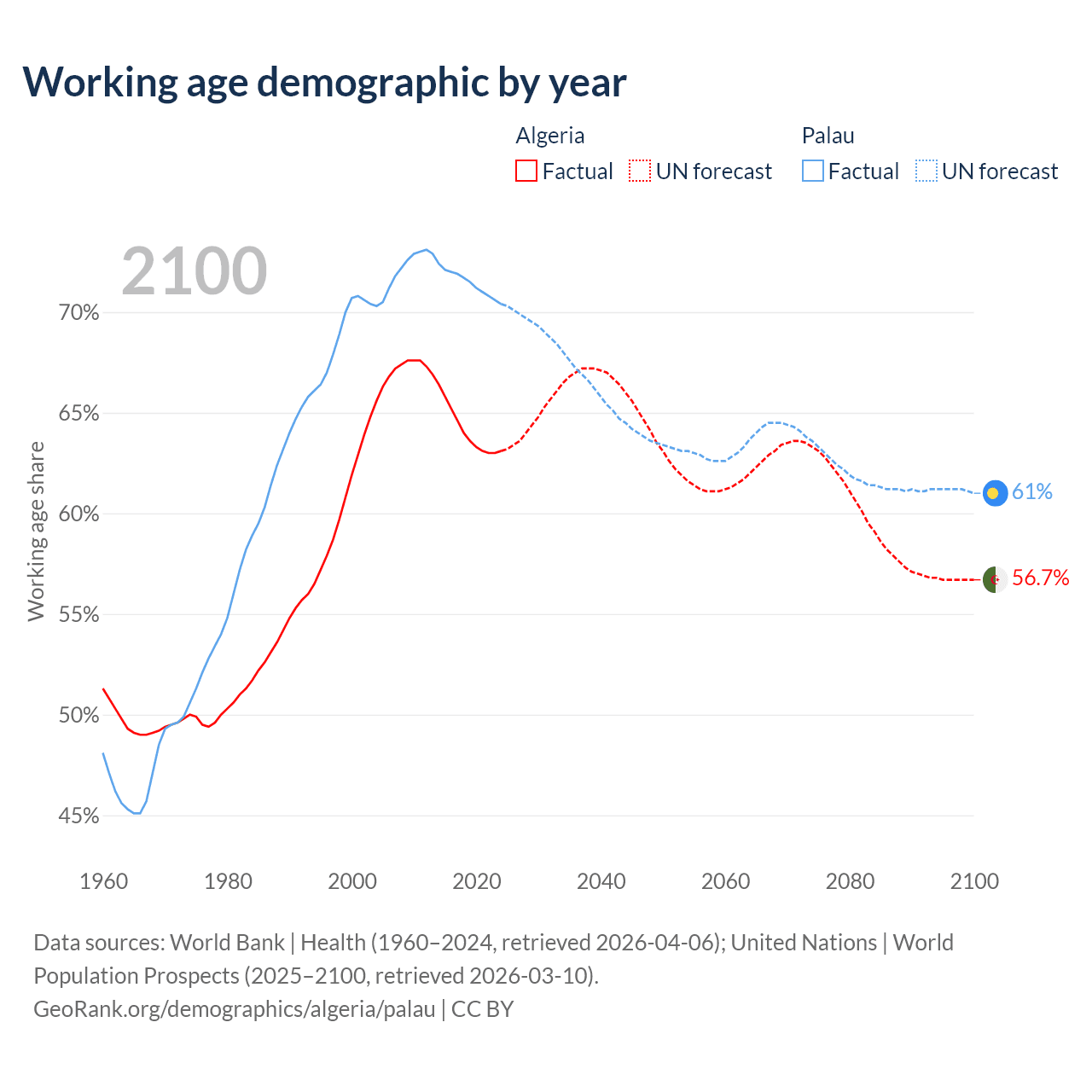 - Algeria has 30.4M working age adults (aged 15-64) vs 12.4K in Palau.