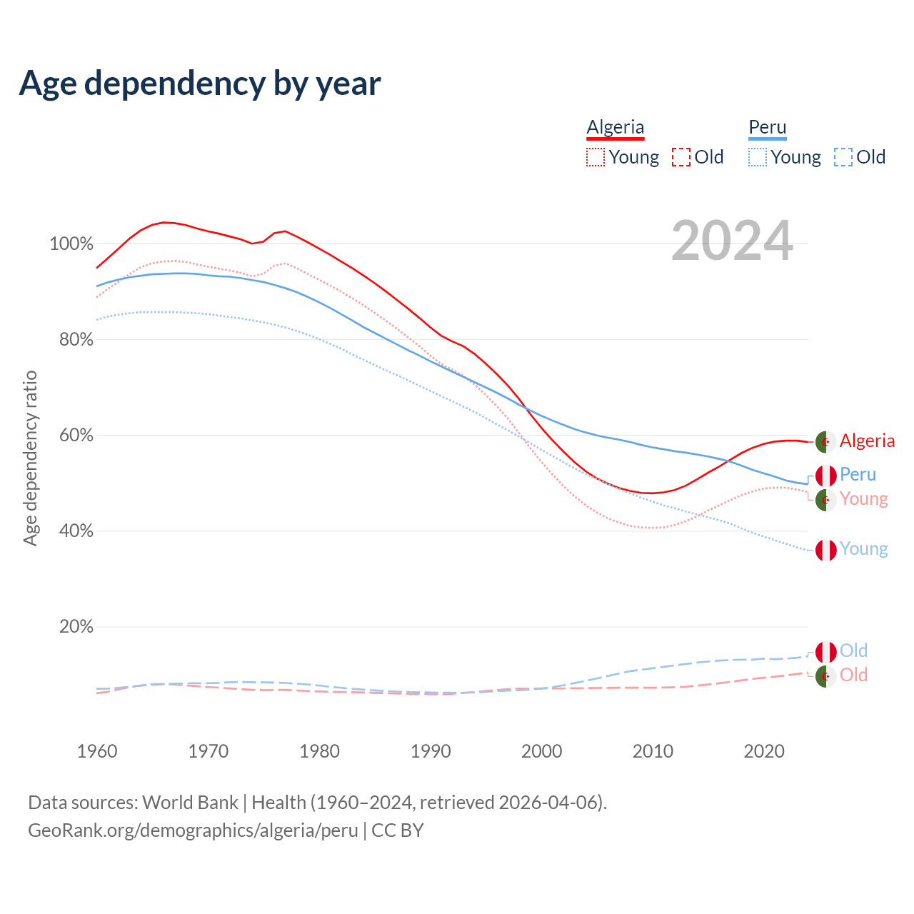 - Algeria is ranked 111/196 by median age (oldest to youngest) vs 97/196 for Peru.