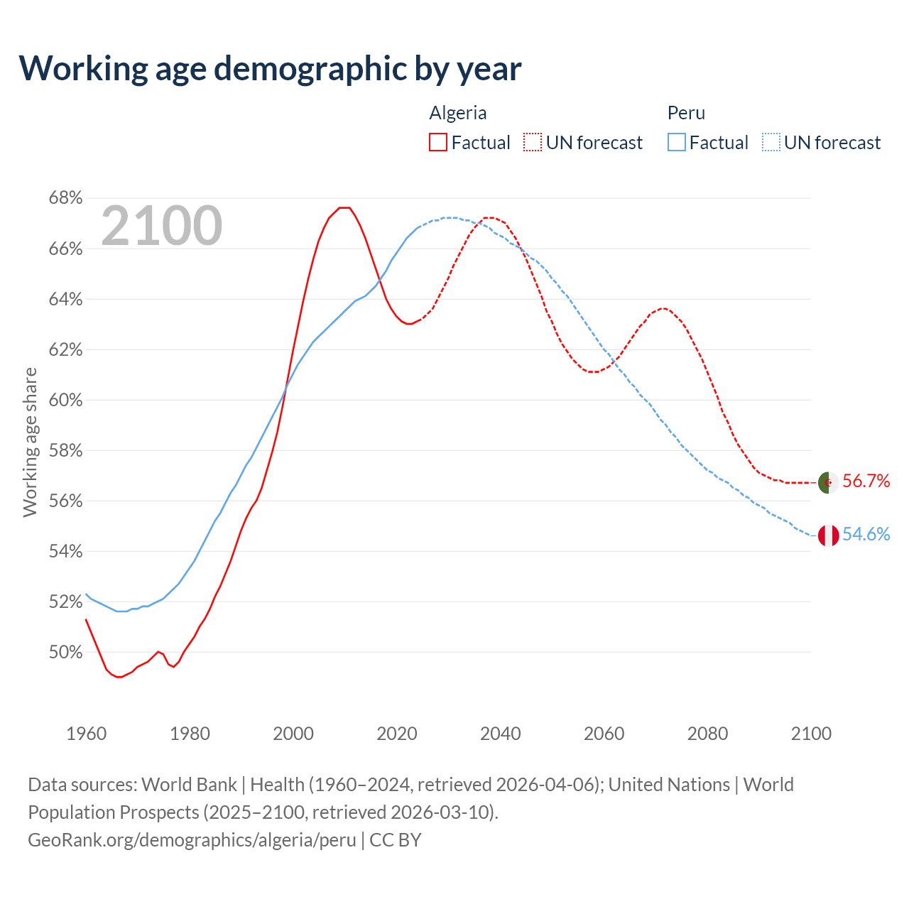 - Algeria has 30.4M working age adults (aged 15-64) vs 23.4M in Peru.