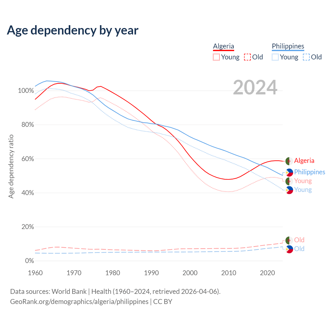 Data sources: World Bank | Health (1960–2024, retrieved 2026-04-06); U.S. Census Bureau (1960–2024, retrieved 2026-02-08).