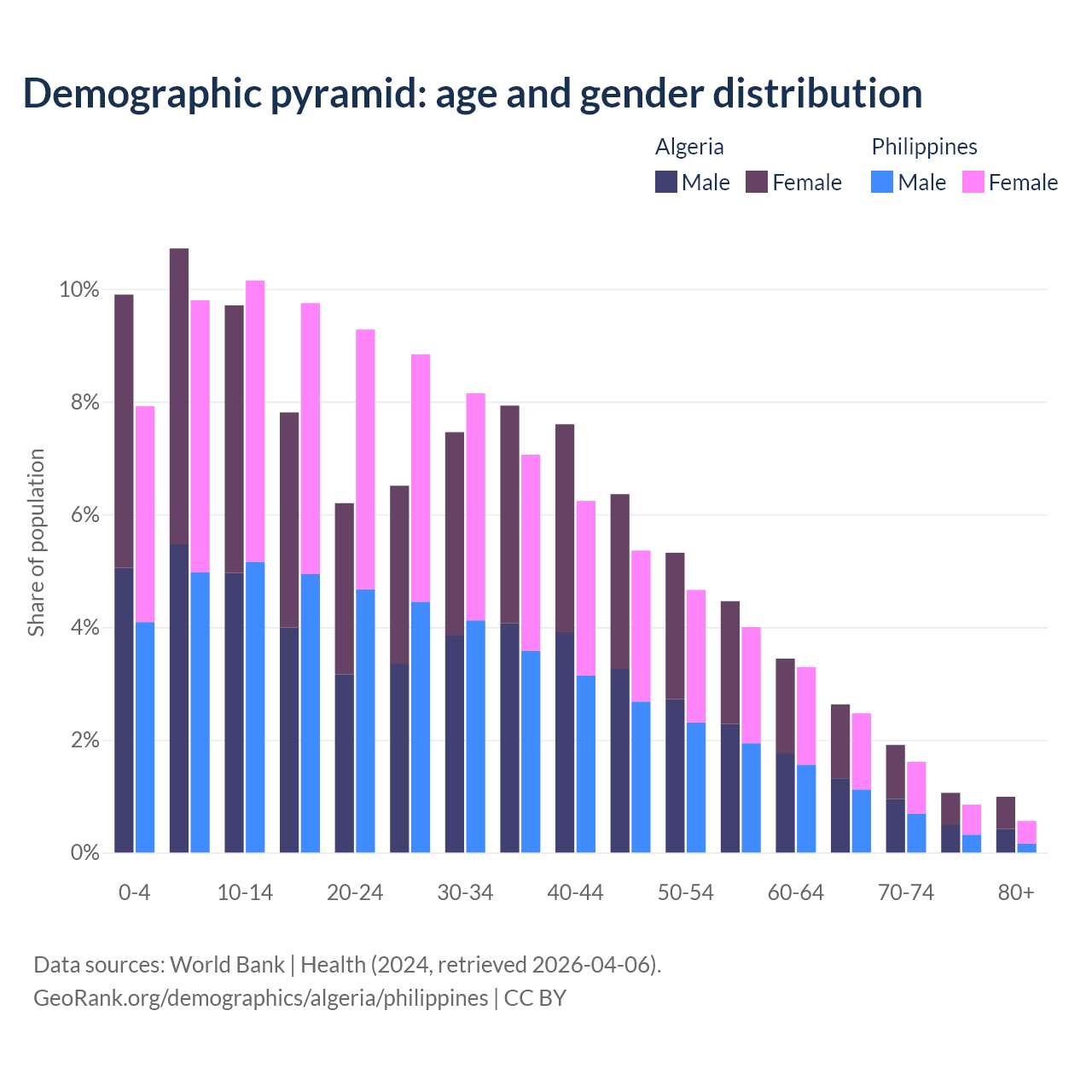 - The share of old-age demographic (65+) in Algeria is 6.58% vs 5.49% in the Philippines.