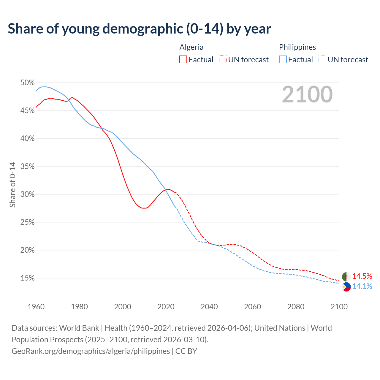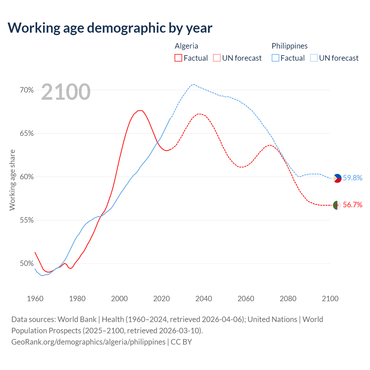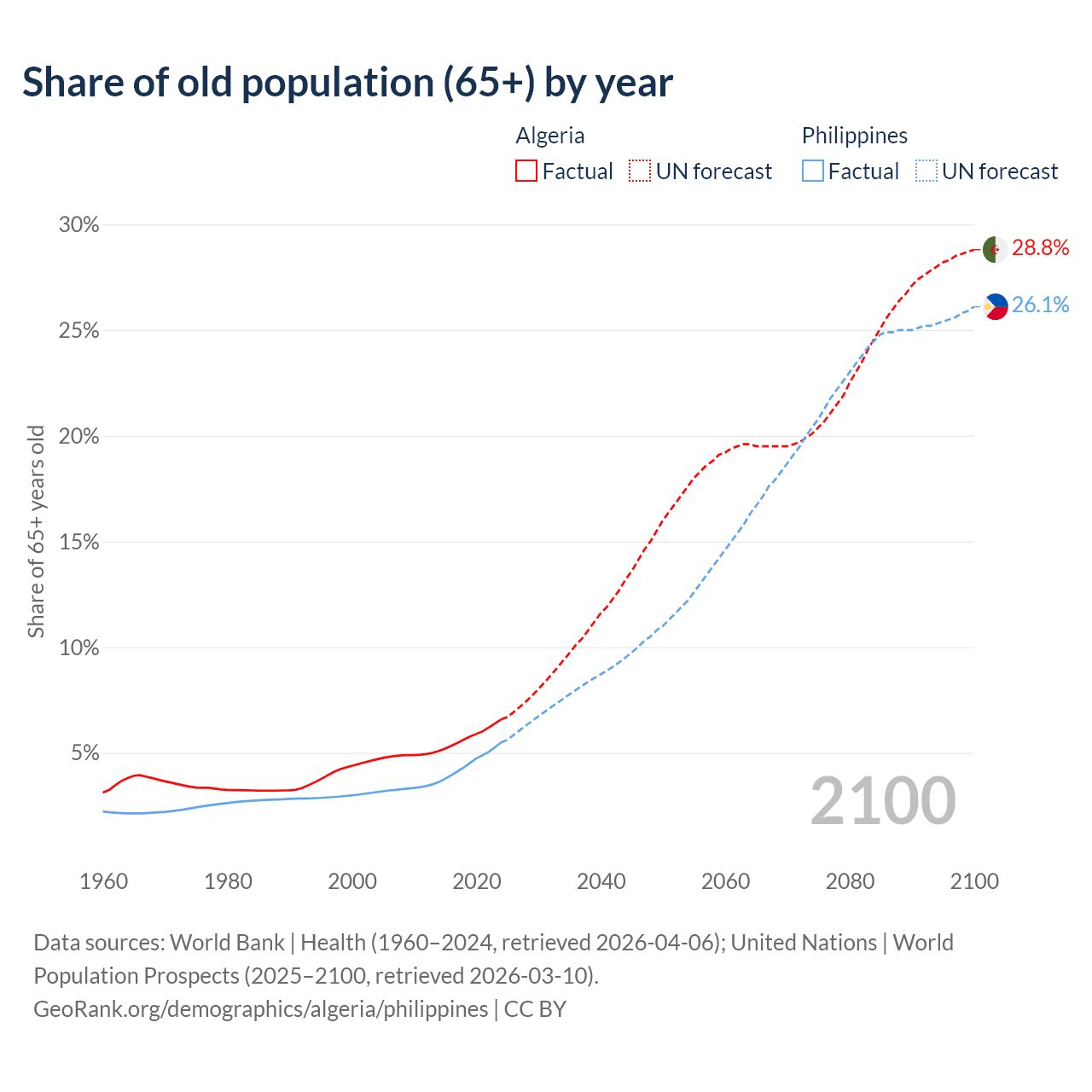 Median age Algeria vs Philippines, 1960-2100