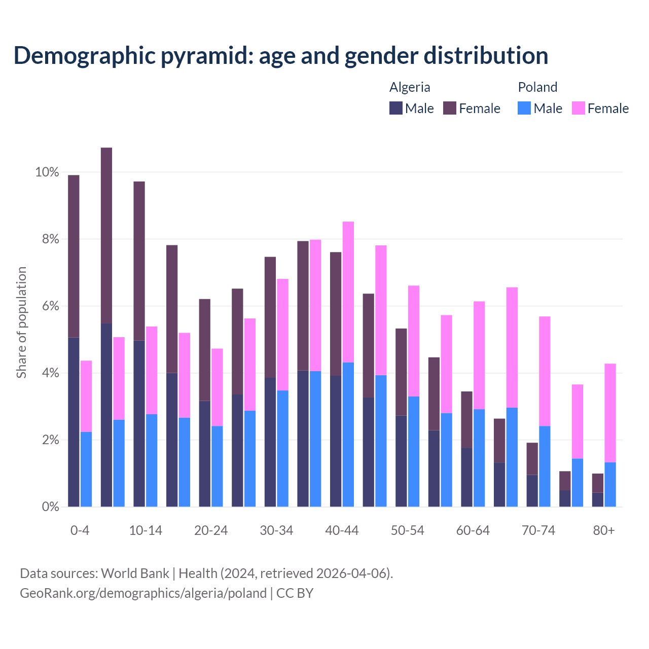 - Algeria is ranked 111/196 by median age (oldest to youngest) vs 30/196 for Poland.