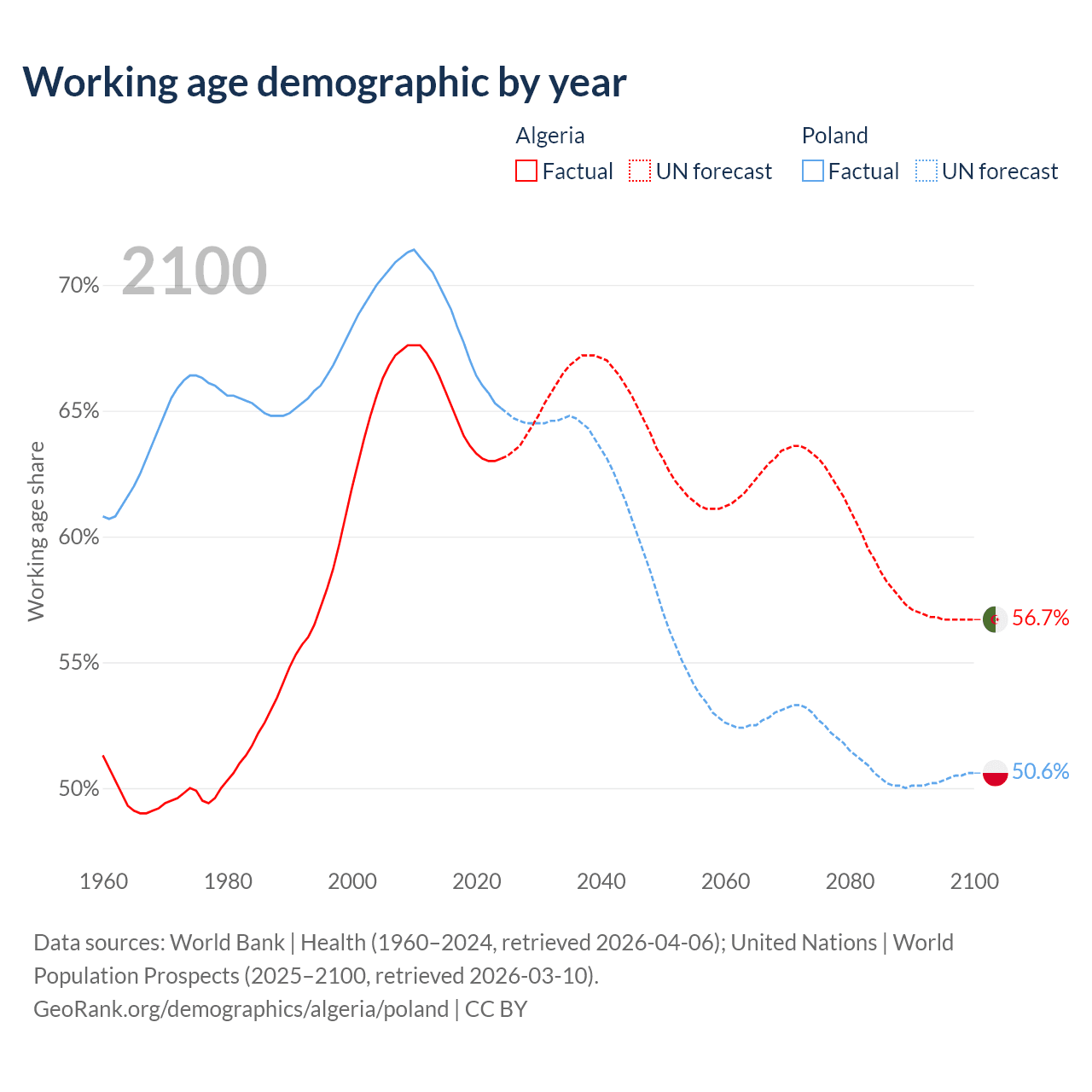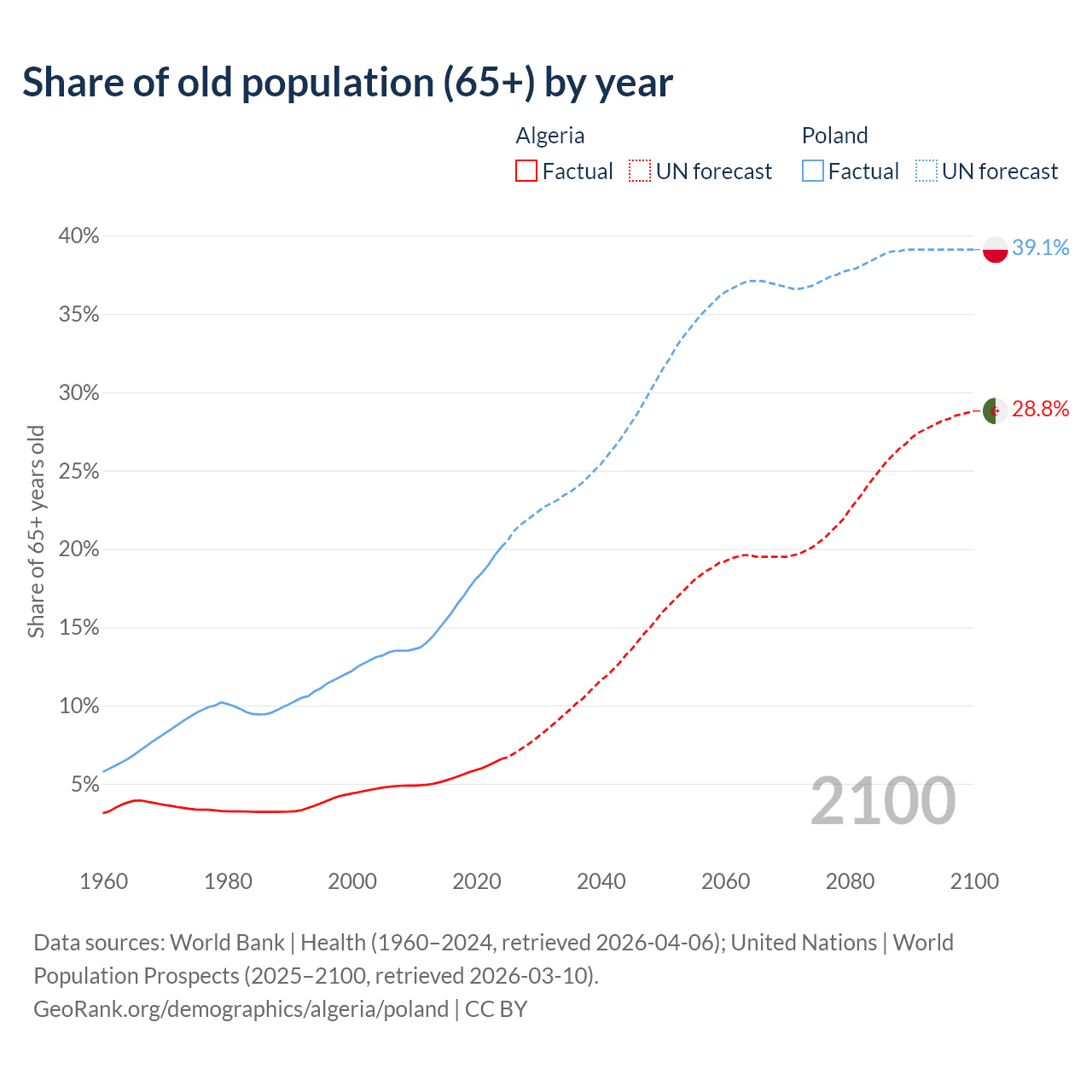 Median age Algeria vs Poland, 1960-2100