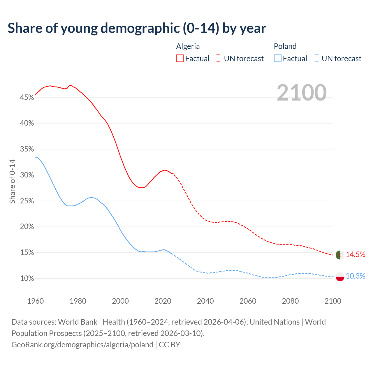 - The share of young demographic (0-15 years old) in Algeria is 30.3% vs 14.8% in Poland.