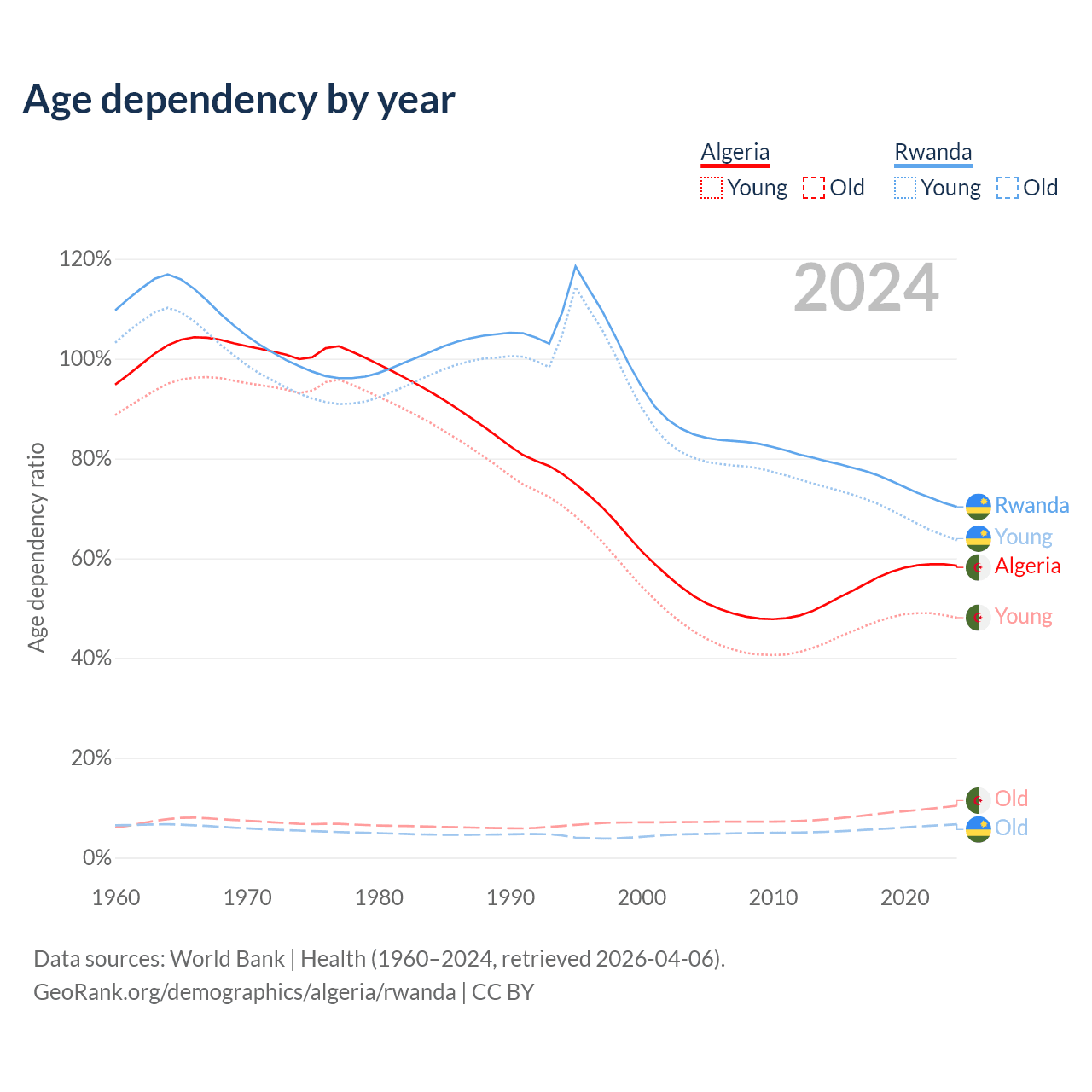 - Algeria is ranked 111/196 by median age (oldest to youngest) vs 160/196 for Rwanda.
