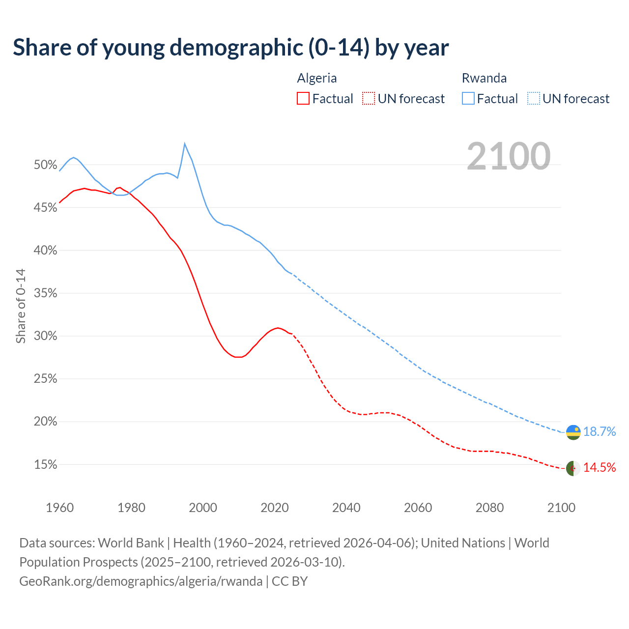 - The share of young demographic (0-15 years old) in Algeria is 30.3% vs 37.4% in Rwanda.