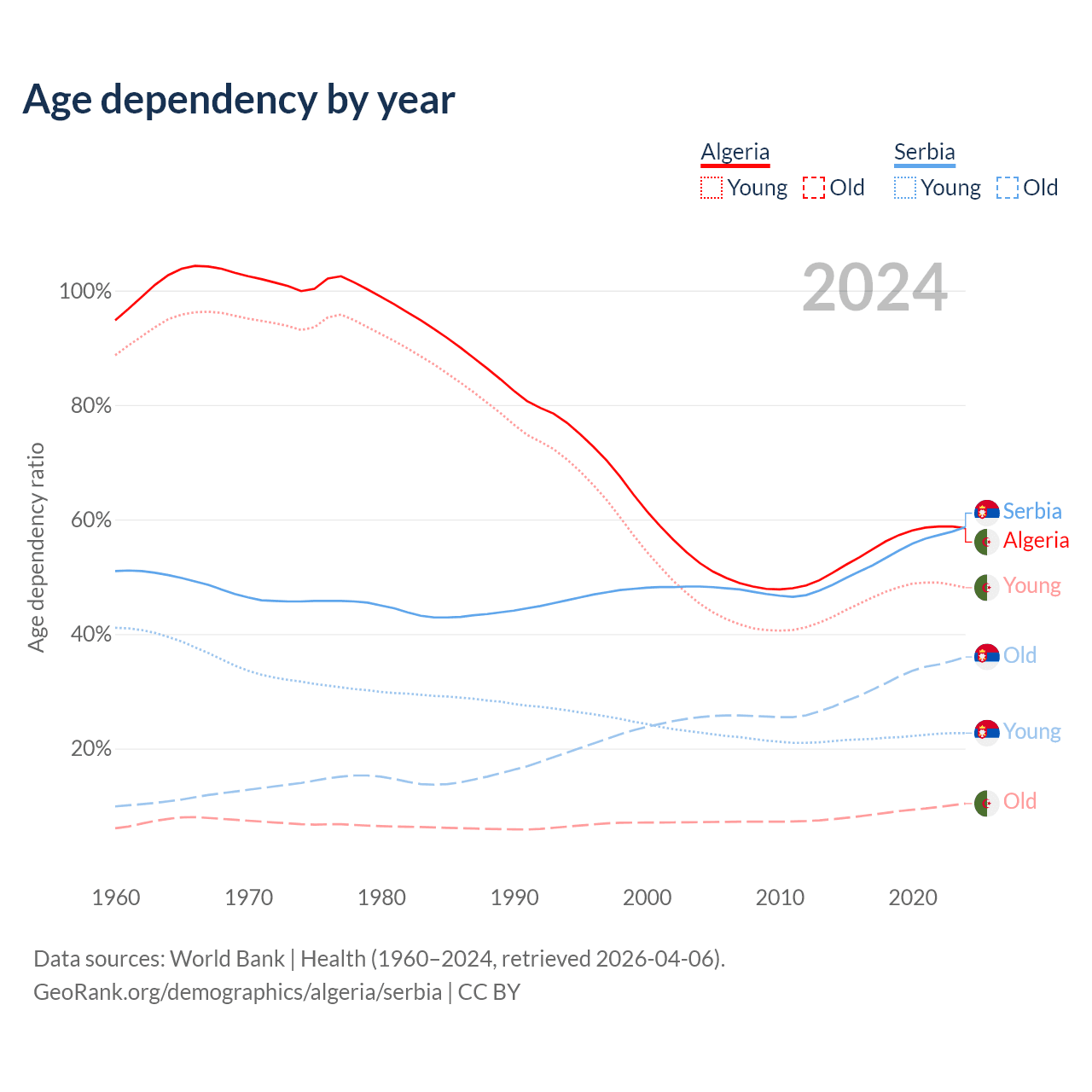 - Algeria is ranked 111/196 by median age (oldest to youngest) vs 15/196 for Serbia.