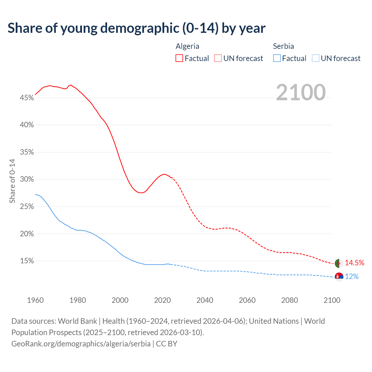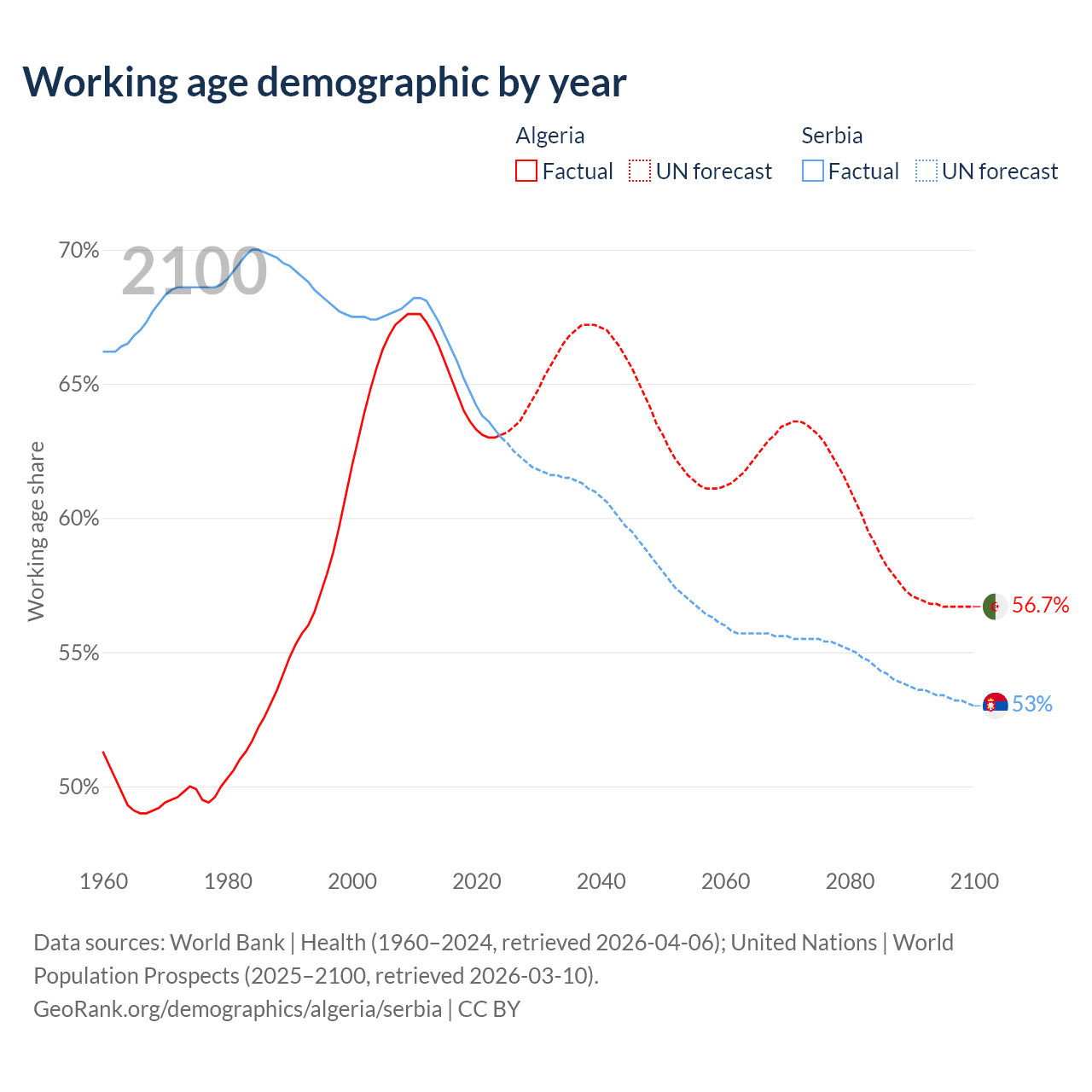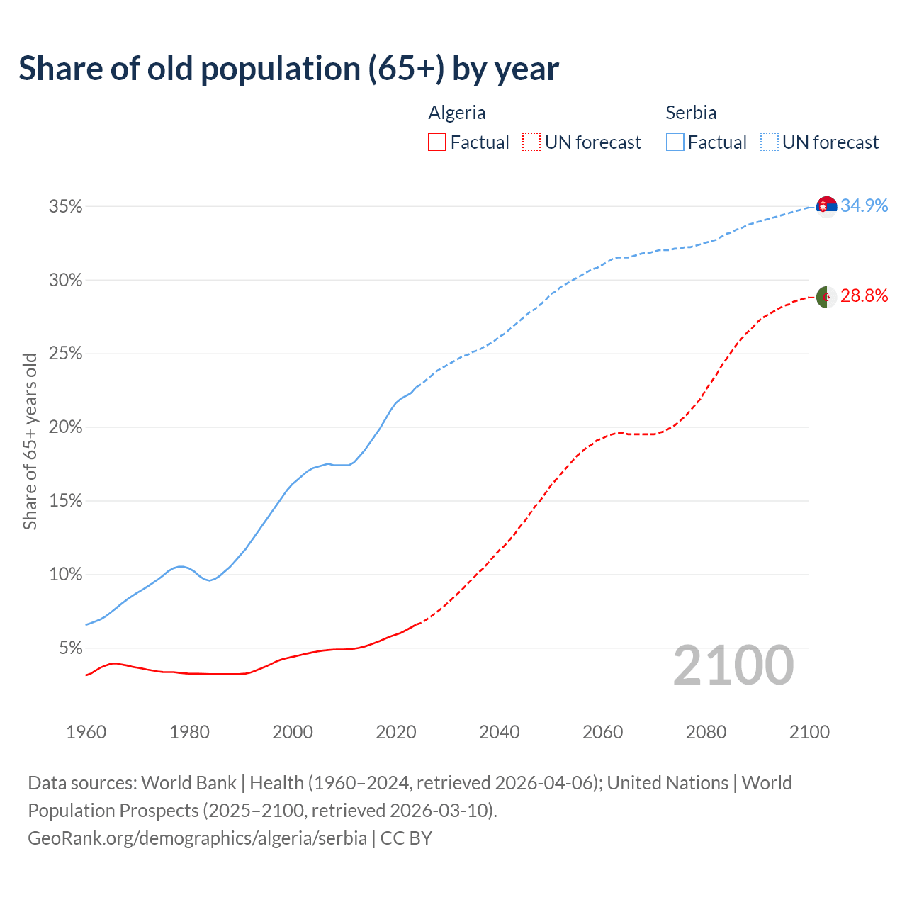 Median age Algeria vs Serbia, 1960-2100