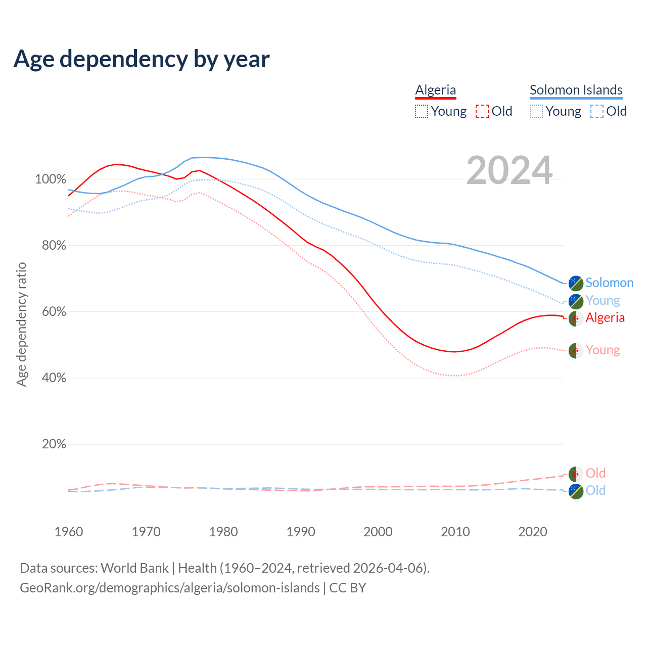 - Algeria is ranked 111/196 by median age (oldest to youngest) vs 153/196 for the Solomon Islands.